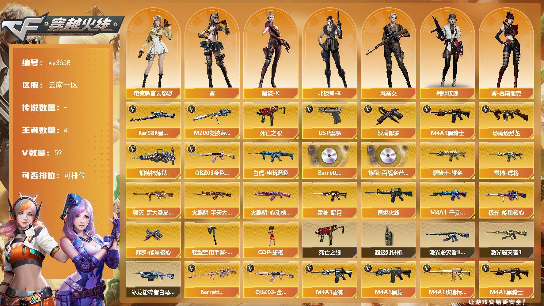 [17002186]云南一区-59V-4王者-0炫金 【热门武器】:QBZ03-金色蔷薇,M200-竞技荣光,死亡之眼,白虎-电玩蓝兔,Kar98K-星神,M4A1-黑骑士,汤姆逊-烈龙,加特林-炼狱,USP-雷暴,沙鹰-修罗*2 【音效卡】:Barrett-碧霄极光音效卡,炼狱-百战金芒-庆典舞曲音效卡 【皮肤】:雷神-暗月,雷神-虎将,M4A1-再燃火线,火麒麟-平天大圣,火麒麟-心动糖果,毁灭-黑大圣皮肤,M4A1-千变-孔明皮肤,黑骑士耀金皮肤,极光-能量核心,修罗-能量核心,轻型军用手斧-再燃火线 【角色】:葵,电竞教官-云悠悠,暗夜-X,北极狐-X,风暴女,荆棘玫瑰,葵-赛博朋克,潘多拉-X,斯沃特-X,游珑儿 【人偶武器】:COP-旗袍 【暴走生化】:死亡之眼,超级对讲机 【挑战大师】:冰龙粉碎者-白马银枪,激光毁灭者III-白马银枪,激光毁灭者III 【英雄级武器】:AK47-火麒麟*2,M4A1-黑龙,M4A1-雷神,M4A1-黑骑士,M4A1-死神,AK12-天启,黑武士-锦绣游龙,M4A1-玫瑰精灵,QBZ03-金色蔷薇,白虎-电玩蓝兔,Barrett-毁灭,Barrett-极光,Kar98K-星神,M200-竞技荣光,Barrett-金色蔷薇*2,王者之怒-觉醒版,加特林-炼狱,炼狱-百战金芒,汤姆逊-烈龙,沙鹰-修罗*2,USP-雷暴,柯尔特-竞技荣光,屠龙*2,擎天,麒麟刺,擎天-竞技荣光,麒麟刺-百战金芒,雷霆王者之锋-觉醒版,高爆手雷-竞技荣光*8,闪光弹-竞技荣光*8,烟雾弹-竞技荣光*7,M4A1-赤狱骑士,Barrett-碧霄极光 【道具】:BS战队炫彩背包,CFS限定背包,炫彩背包-诺拉,百战金芒炫彩背包,超级背包,女皇终结者-魔龙之吻,绿色巨人,灵魂忍者*2,妖姬,迷雾幽灵*2,夺命之镰,防化服*3,星辰流光-枪王排位,流光-鎏金之域,流光-再燃火线,枪王排位28赛季金色流光,枪王排位29赛季金色流光,语音特效-盛典烟火,萌萌小葵表情,电玩兔兔表情,EP战队名片,EP战队喷图,防弹头盔*5,防弹衣*5,C4工具钳*5,手雷包*5 【特殊枪械】:1黑骑士,1烈龙,1炼狱