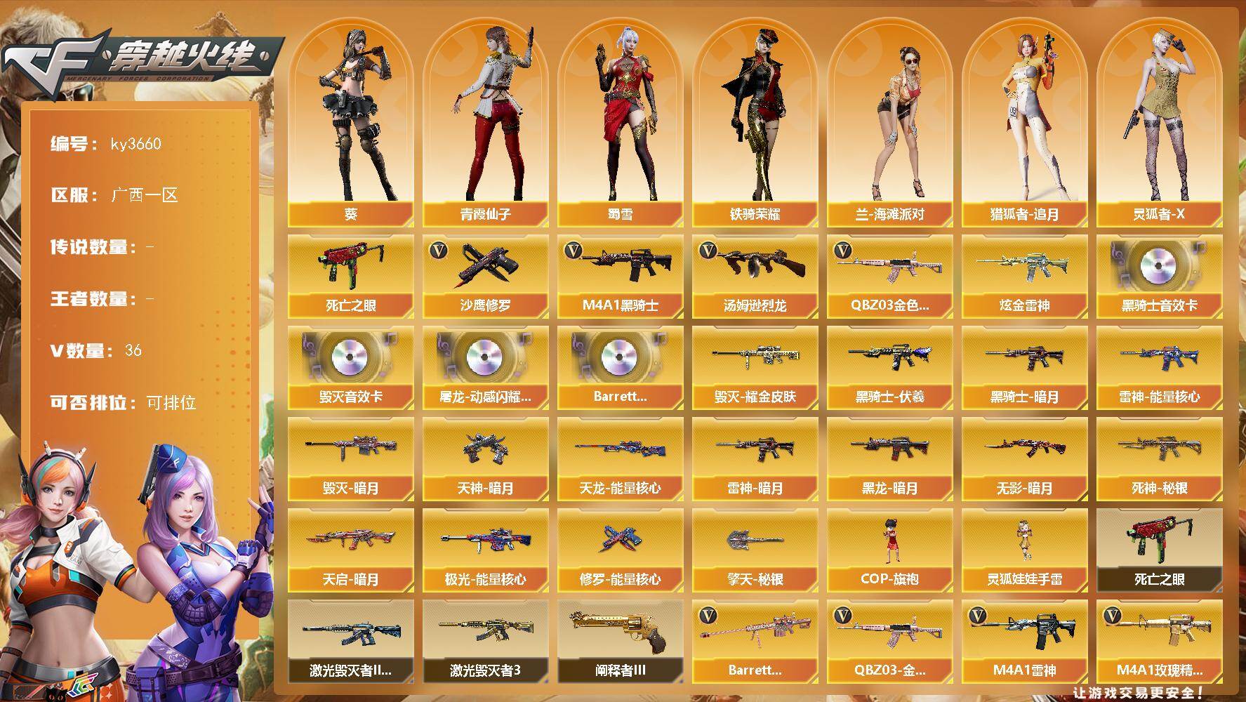 [16997061]广西一区-36V-0王者-1炫金 【热门武器】:QBZ03-金色蔷薇,死亡之眼*4,M4A1-黑骑士,汤姆逊-烈龙*3,沙鹰-修罗*3 【王者炫金武器】:炫金雷神 【音效卡】:屠龙-动感闪耀 音效卡,M4A1-黑骑士音效卡,Barrett-毁灭音效卡,Barrett-碧霄极光音效卡 【皮肤】:雷神-暗月,雷神-能量核心*2,毁灭-暗月,毁灭耀金皮肤,黑龙-暗月*3,黑骑士-暗月,黑骑士-伏羲,无影-暗月*2,死神-秘银*3,天启-暗月*2,天龙-能量核心,极光-能量核心*3,修罗-能量核心,天神-暗月*3,擎天-秘银 【角色】:葵,兰-海滩派对,猎狐者-追月,灵狐者-X,麻雀,娜塔莉娅,青霞仙子,斯沃特-X,蜀雪,铁骑荣耀,樱-战斗天使,影武者-X,游珑儿 【人偶武器】:COP-旗袍,灵狐娃娃手雷 【暴走生化】:死亡之眼*4 【挑战大师】:激光毁灭者III-白马银枪,激光毁灭者III,阐释者III 【英雄级武器】:AK47-火麒麟,M4A1-雷神*2,M4A1-黑骑士,M4A1-死神,AK47-黑鲨,黑武士-锦绣游龙,M4A1-玫瑰精灵*2,QBZ03-金色蔷薇,AWM-天龙*3,Barrett-毁灭,Barrett-极光,Barrett-金色蔷薇,汤姆逊-烈龙*3,AA-12-雷霆,沙鹰-修罗*3,沙鹰-天神,屠龙,龙啸,擎天*2,麒麟刺*2,斩神刀-雷暴,高爆手雷-雷暴,闪光弹-雷暴,烟雾弹-雷暴 【道具】:战舰背包,超级背包,女皇终结者-魔龙之吻,救世主-黑桃战神,绿色巨人,灵魂忍者,变异宝贝,迷雾幽灵,夺命之镰,防化服*2,金色流光-枪王排位,星辰流光-枪王排位,流光-再燃火线,枪王排位28赛季金色流光,防弹头盔*2,防弹衣*2,C4工具钳*2,手雷包*2 【特殊枪械】:1黑骑士,3烈龙