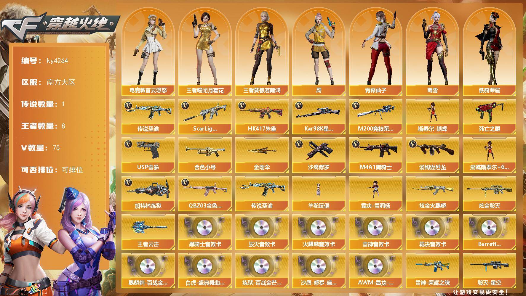 [16756931]南方大区-75V-8王者-2炫金 【传说武器】:传说圣谕 【热门武器】:传说圣谕,QBZ03-金色蔷薇,Scar Light-白虎,HK417-朱雀,M200-竞技荣光,死亡之眼,Kar98K-星神,金色小号,M4A1-黑骑士,汤姆逊-烈龙*6,加特林-炼狱,斯泰尔-蝴蝶,羊驼玩偶,裁决-雪莉杨,USP-雷暴,沙鹰-修罗,金刚伞*2 【王者炫金武器】:王者云击,炫金火麒麟,炫金毁灭 【音效卡】:AK47-火麒麟音效卡,M4A1-雷神音效卡,M4A1-黑骑士音效卡,Barrett-毁灭音效卡,AWM-裁决音效卡,Barrett-碧霄极光音效卡,麒麟刺-百战金芒-盛典舞曲音效卡,白虎-盛典舞曲音效卡,炼狱-百战金芒-庆典舞曲音效卡,沙鹰-修罗-盛典舞曲音效卡,AWM-昌龙-怀旧音效卡 【皮肤】:裁决-运输船 皮肤,裁决-胜者为王 皮肤,雷神-荣耀之魄,M4A1-再燃火线,火麒麟-雷神,火麒麟-心动糖果,毁灭-星空,毁灭-风暴,M4A1-千变-孔明皮肤,黑龙-墨子皮肤,黑骑士-地狱火,黑武士-典韦皮肤,屠龙-荣耀之锋,轻型军用手斧-再燃火线 【角色】:电竞教官-云悠悠,鹰,战地猎狐,王者-瞳-闭月羞花,王者葵-惊若翩鸿,暗夜-X,初恋灵狐,嘉年华灵狐,灵狐者-X,流浪蔷薇,龙儿-小淘气,潘多拉-X,青霞仙子,斯沃特-X,蜀雪,铁骑荣耀,游珑儿 【人偶武器】:裁决-雪莉杨,斯泰尔-蝴蝶,AWM-灵狐-15周年嘉年华*2,COP-旗袍*2,迷你深渊冰龙,夺魂,迷你牛牛,迷你生化手雷,深渊终结者手雷,灵狐娃娃手雷 【暴走生化】:双面神,死亡之眼,超级对讲机 【挑战大师】:冰龙粉碎者-白马银枪,激光毁灭者III*2,神圣爆裂者-末日III 【英雄级武器】:AK47-火麒麟*2,M4A1-黑龙,M4A1-雷神,M4A1-黑骑士,AK47-无影,AK47-黑武士,AK12-天启,AK47-黑鲨,M4A1-龙血,HK417-朱雀,Scar Light-白虎,无影-神兵利器,QBZ03-金色蔷薇,王者之影-觉醒版,王者冰魄-觉醒版,Barrett-毁灭,AWM-裁决,Kar98K-星神,M200-竞技荣光,加特林-炼狱,炼狱-百战金芒,汤姆逊-烈龙*6,沙鹰-修罗,沙鹰-天神,USP-雷暴,COP 357-雷霆王者-觉醒版,柯尔特-竞技荣光*4,屠龙*5,马来剑-夜魔,麒麟刺,擎天-竞