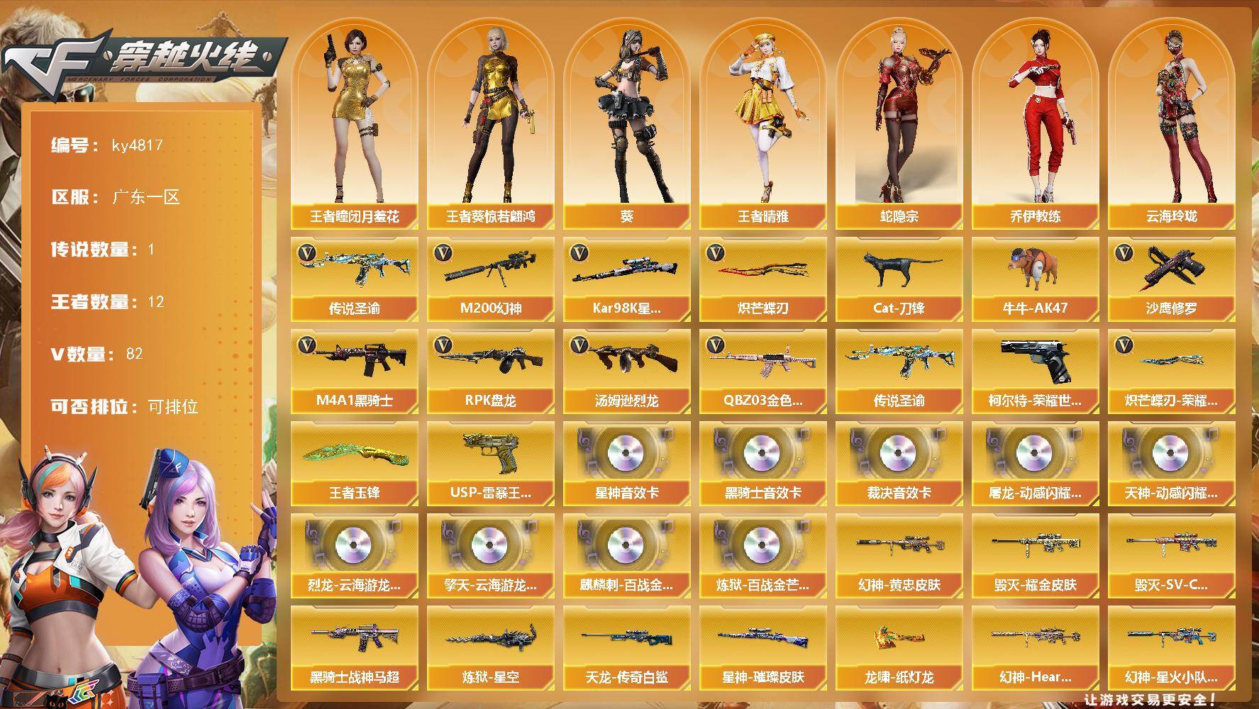 [16760548]广东一区-82V-12王者-0炫金 【传说武器】:传说圣谕 【传说角色】:传说星骇 【热门武器】:传说圣谕,QBZ03-金色蔷薇,M200-幻神,柯尔特-荣耀世冠白鲨2023,Kar98K-星神,Cat-刀锋,牛牛-AK47,M4A1-黑骑士*3,汤姆逊-烈龙*5,RPK-盘龙*5,沙鹰-修罗,炽芒蝶刃,炽芒蝶刃-荣耀世冠白鲨2023 皮肤 【王者炫金武器】:USP-雷暴王者,王者玉锋 【音效卡】:屠龙-动感闪耀 音效卡,天神-动感闪耀 音效卡,烈龙-云海游龙音效卡,擎天-云海游龙音效卡,M4A1-黑骑士音效卡,AWM-裁决音效卡,Kar98K-星神音效卡,麒麟刺-百战金芒-盛典舞曲音效卡,炼狱-百战金芒-庆典舞曲音效卡 【皮肤】:M200-幻神-黄忠皮肤,幻神-Heartshot 皮肤,幻神-星火小队签名臻藏版 皮肤,金色蔷薇-破浪逐光 皮肤,AWM-裁决-凤灵皮肤,裁决-典雅胡桃 皮肤,星神-璀璨皮肤,星神-傲竹金蛇 皮肤,雷神-脉冲核心,M4A1-雷神-新春神龙皮肤,M4A1-再燃火线,火麒麟-雷神,毁灭耀金皮肤,毁灭-SV-CFPLS16冠军,毁灭-英雄计划 皮肤,黑骑士-战神马超,AWM-天龙-传奇白鲨,炼狱-星空,屠龙-春桃 皮肤,屠龙-破浪逐光 皮肤,龙啸-纸灯龙皮肤,轻型军用手斧-再燃火线,炽芒蝶刃-荣耀世冠白鲨2023 皮肤 【角色】:葵,王者-瞳-闭月羞花,王者葵-惊若翩鸿,王者晴雅,蛇隐宗,乔伊教练,云海玲珑,暗夜-X,初恋灵狐,芳心审判者,风暴女,虎妞,嘉年华灵狐,娟娟,猎狐者-追月,灵狐-花神,灵狐者-X,灵狐者-黄金海岸,灵狐者-七夕宝贝,麻雀,曼陀罗-礼服,潘多拉-X,潘多拉-甜心教官,赛斯-X,蛇姬,斯沃特-X,兔囡囡,夜玫瑰-幻能朋克 【人偶武器】:巴雷特-零-水下丽影,AWM-灵狐-15周年嘉年华,Cat-刀锋,牛牛-AK47,迷你波特博士,夺魂,迷你生化手雷*2,生化手雷-机甲核心*2,深渊终结者手雷,M37-奇洋探员,QBZ03-斯沃特,灵狐娃娃手雷 【暴走生化】:超级对讲机 【挑战大师】:激光毁灭者III-白马银枪,神圣爆裂者-末日III 【英雄级武器】:AK47-火麒麟,M4A1-黑龙,M4A1-雷神,M4A1-黑骑士*3,AN94-超新星,M4A1-龙血,无影-神兵利器,SCAR Light-玄豹,QBZ03-金色蔷薇