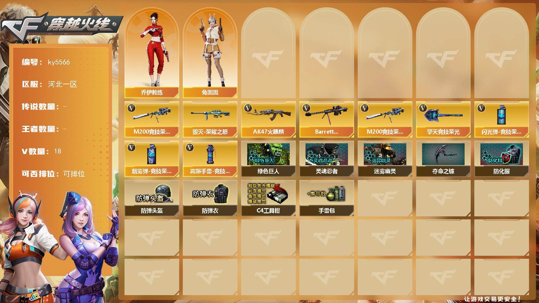 [16910870]河北一区-18V-0王者武器数-0炫金武器数 【热门武器】:M200-竞技荣光 【皮肤】:毁灭-荣耀之怒 【角色】:乔伊教练,兔囡囡 【英雄级武器】:AK47-火麒麟,Barrett-毁灭*2,M200-竞技荣光,擎天-竞技荣光,高爆手雷-竞技荣光*4,闪光弹-竞技荣光*3,烟雾弹-竞技荣光*3 【道具】:绿色巨人,灵魂忍者,迷雾幽灵,夺命之镰,防化服*2,防弹头盔*2,防弹衣*2,C4工具钳*2,手雷包*2 【特殊枪械】: