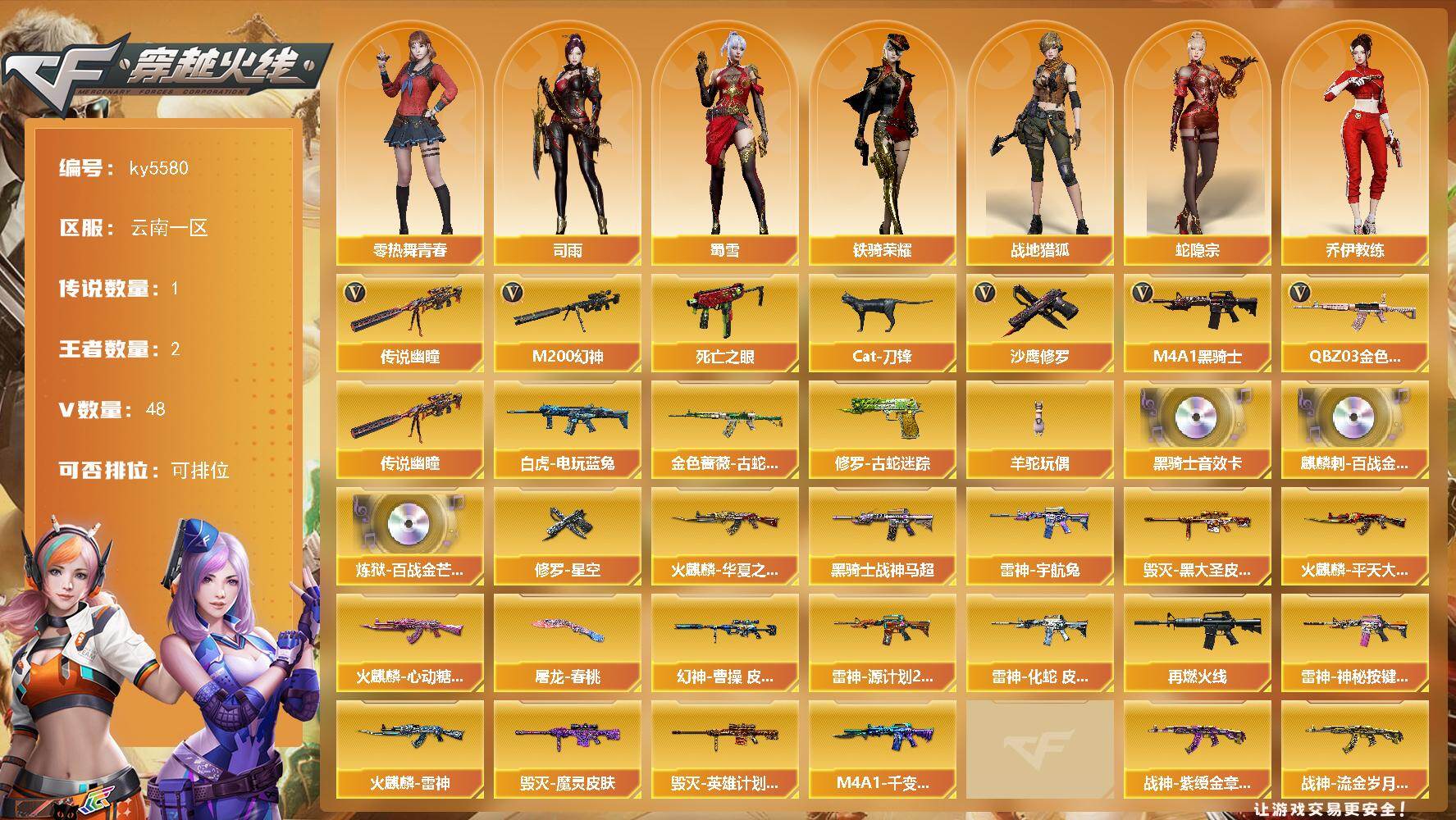 [16911979]云南一区-48V-2王者武器数-0炫金武器数 【传说武器】:传说幽瞳 【热门武器】:传说幽瞳,QBZ03-金色蔷薇,M200-幻神,金色蔷薇-古蛇迷踪,修罗-古蛇迷踪,死亡之眼,白虎-电玩蓝兔,Cat-刀锋,M4A1-黑骑士*2,羊驼玩偶,沙鹰-修罗 【音效卡】:M4A1-黑骑士音效卡,麒麟刺-百战金芒-盛典舞曲音效卡,炼狱-百战金芒-庆典舞曲音效卡 【皮肤】:幻神-曹操 皮肤,金色蔷薇-电竞之星 皮肤,裁决-星际旅行 皮肤,雷神-宇航兔皮肤,雷神-源计划2.0专属 皮肤,雷神-化蛇 皮肤,M4A1-再燃火线,雷神-神秘按键 皮肤,火麒麟-雷神,火麒麟-华夏之心,火麒麟-平天大圣,火麒麟-心动糖果,毁灭-黑大圣皮肤,毁灭-魔灵皮肤,毁灭-英雄计划 皮肤,M4A1-千变-孔明皮肤,黑骑士-战神马超,超新星-深海萌鲨 皮肤,战神-紫绶金章皮肤,战神-流金岁月皮肤*3,Barrett-金色蔷薇-蛇姬 皮肤,修罗-星空,屠龙-春桃 皮肤,轻型军用手斧-再燃火线 【角色】:司雨,战地猎狐,蛇隐宗,奇洋探员,乔伊教练,修道士,暗夜-X,初恋灵狐,电竞少女,芳心审判者,飞虎队-X,风暴女*2,虎妞,嘉年华灵狐,娟娟,猎狐者-追月,零-热舞青春,灵狐者-黄金海岸,龙儿,麻雀,萌儿,潘多拉-X,潘多拉-甜心教官,蛇姬,斯沃特-X,蜀雪,铁骑荣耀,兔囡囡,维纳斯,雪莉杨,雪莉杨-摸金校尉,夜玫瑰-宠粉,游珑儿 【人偶武器】:AWM-灵狐-15周年嘉年华*2,M37-葵,Cat-刀锋,迷你深渊冰龙*3,迷你牛牛,生化手雷-机甲核心,闪光弹-小乔,灵狐娃娃手雷*2 【暴走生化】:死亡之眼,超级对讲机 【挑战大师】:冰龙粉碎者-白马银枪,激光毁灭者III-白马银枪,神圣爆裂者-末日III 【英雄级武器】:AK47-火麒麟,M4A1-雷神*2,M4A1-黑骑士*2,AK12-天启,无影-神兵利器,黑武士-锦绣游龙,超新星-热带奇洋,金色蔷薇-古蛇迷踪,QBZ03-金色蔷薇,AK-47-猩红传说*5,AK47-B-战神,QBZ-03-王者蔷薇-觉醒版,白虎-电玩蓝兔,Barrett-毁灭*2,M200-幻神,炼狱-百战金芒,AA-12-雷霆,沙鹰-修罗,沙鹰-天神*2,COP 357-雷霆王者-觉醒版,修罗-古蛇迷踪,屠龙,擎天,龙啸-热带奇洋,麒麟刺-百战金芒,手雷-热带奇洋,高爆手雷-古蛇