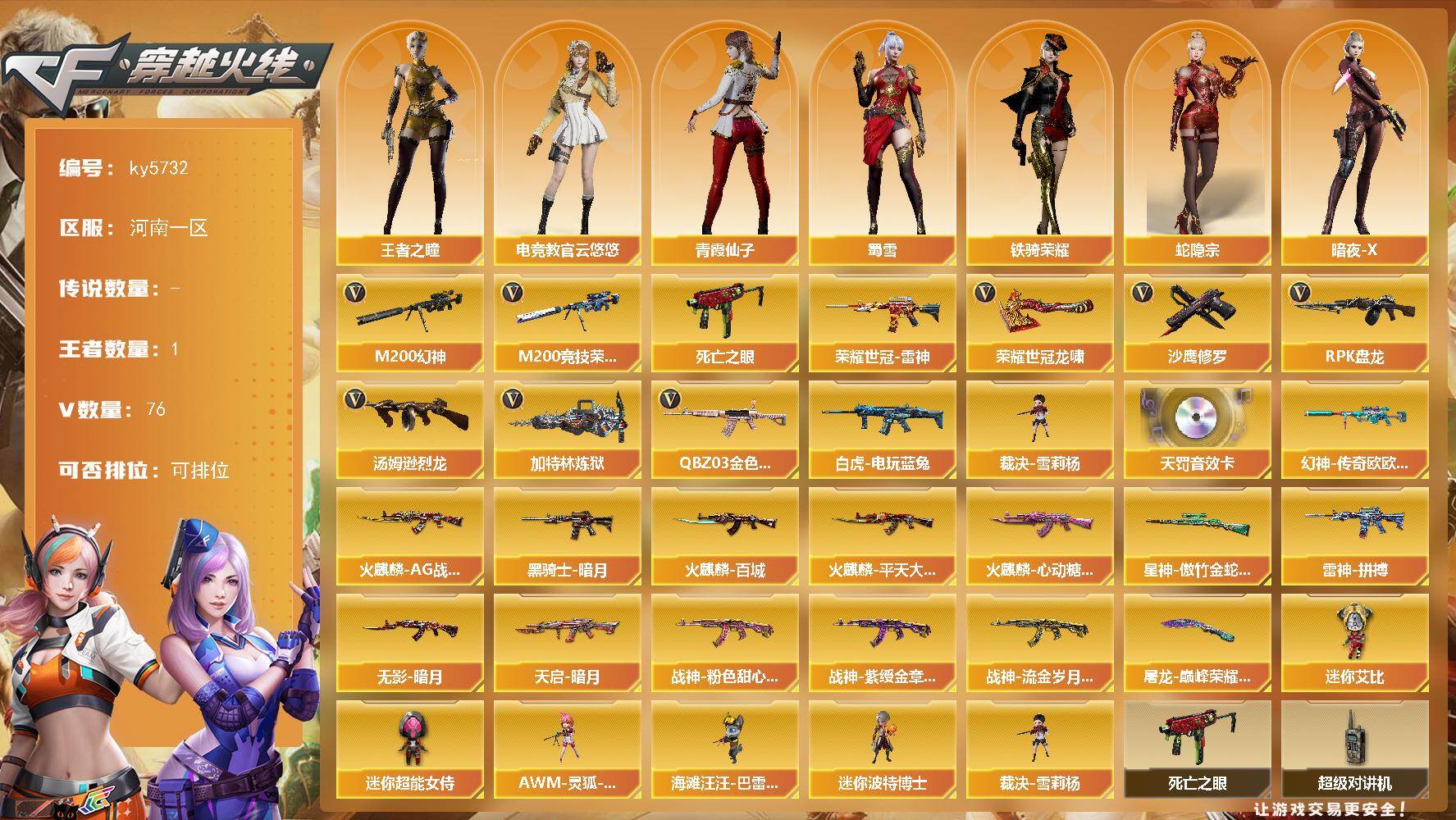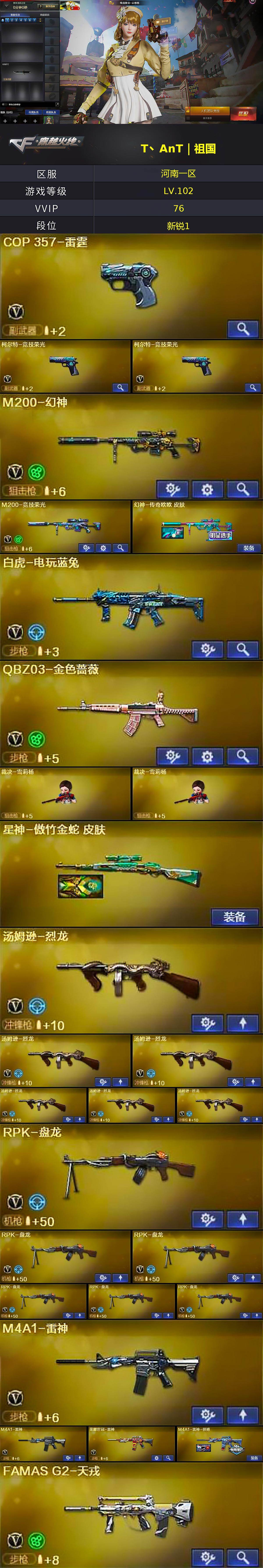 [16810013]河南一区-76V-1王者武器数-0炫金武器数 【热门武器】:QBZ03-金色蔷薇,M200-幻神,M200-竞技荣光,死亡之眼,荣耀世冠-雷神,白虎-电玩蓝兔,汤姆逊-烈龙*6,RPK-盘龙*6,加特林-炼狱,裁决-雪莉杨*2,沙鹰-修罗*3,荣耀世冠-龙啸 【音效卡】:QBZ03-天罚音效卡 【皮肤】:幻神-传奇欧欧 皮肤,星神-傲竹金蛇 皮肤,M4A1-雷神-拼搏,火麒麟-AG战队皮肤,火麒麟-平天大圣,火麒麟-百城,火麒麟-心动糖果,黑骑士-暗月,无影-暗月,天启-暗月,战神-粉色甜心皮肤,战神-紫绶金章皮肤,战神-流金岁月皮肤*2,屠龙-巅峰荣耀 皮肤 【角色】:电竞教官-云悠悠,王者之瞳,蛇隐宗,暗夜-X,初恋灵狐,电竞少女,嘉年华灵狐,猎狐者-追月,灵狐者-七夕宝贝,龙儿,龙儿-小淘气,曼陀罗-X,潘多拉-X,青霞仙子,蛇姬,斯沃特-X,蜀雪,铁骑荣耀,兔囡囡,维纳斯,新娜塔莎,夜玫瑰-宠粉,影武者-X 【人偶武器】:裁决-雪莉杨*2,AWM-灵狐-15周年嘉年华,海滩汪汪-巴雷特,迷你波特博士,迷你艾比,迷你超能女侍 【暴走生化】:死亡之眼,超级对讲机 【挑战大师】:激光毁灭者III-白马银枪 【英雄级武器】:AK47-火麒麟,M4A1-雷神*2,QBZ03-天罚,无影-神兵利器,黑武士-锦绣游龙,FAMAS G2-天戎,QBZ03-金色蔷薇,AK-47-猩红传说*4,王者火魄-觉醒版,白虎-电玩蓝兔,荣耀世冠-雷神,M200-幻神,M200-竞技荣光,VSK-94-金蚀,RPK-盘龙*6,加特林-炼狱,汤姆逊-烈龙*6,沙鹰-修罗*3,沙鹰-天神*3,COP-雷霆,柯尔特-竞技荣光*2,屠龙*3,擎天,擎天-竞技荣光,荣耀世冠-龙啸,高爆手雷-竞技荣光*7,闪光弹-竞技荣光*9,烟雾弹-竞技荣光*11,烟雾弹-古蛇迷踪 【道具】:全能枪王背包,炫彩背包,超级背包,妩媚妖姬,绿色巨人,灵魂忍者*2,变异宝贝,迷雾幽灵*2,夺命之镰*2,防化服*2,金色流光-枪王排位,枪王排位28赛季金色流光,电玩兔兔表情,防弹头盔*8,防弹衣*8,C4工具钳*7,手雷包*7 【特殊枪械】:6烈龙,6盘龙,1炼狱