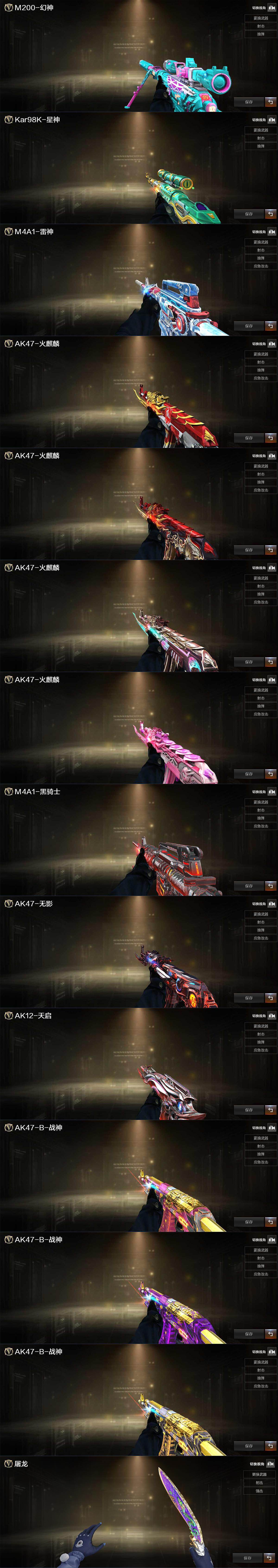 【热门武器】:QBZ03-金色蔷薇,M200-幻神,M200-竞技荣光,死亡之眼,荣耀世冠-雷神,白虎-电玩蓝兔,汤姆逊-烈龙*6,RPK-盘龙*6,加特林-炼狱,裁决-雪莉杨*2,沙鹰-修罗*3,荣耀世冠-龙啸