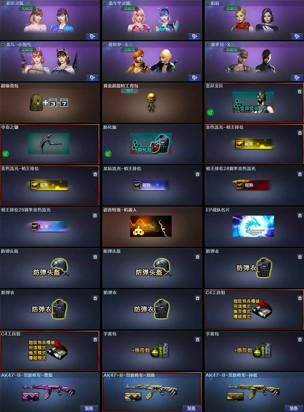 【道具】:超级背包,黄金超能特工背包,变异宝贝,夺命之镰,防化服,金色流光-枪王排位*2,星辰流光-枪王排位,枪王排位28赛季金色流光,枪王排位29赛季金色流光,语音特效-机器人,EP战队名片,防弹头盔*2,防弹衣*3,C4工具钳*2,手雷包*2