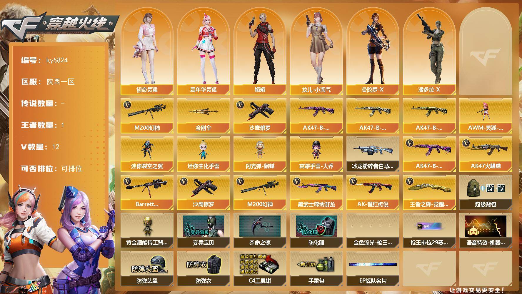 [16942241]陕西一区-13V-1王者武器数-0炫金武器数 【热门武器】:M200-幻神,沙鹰-修罗,金刚伞 【皮肤】:AK47-B-常胜将军-曹操,AK47-B-常胜将军-刘备,AK47-B-常胜将军-孙权 【角色】:初恋灵狐,嘉年华灵狐,娟娟,龙儿-小淘气,曼陀罗-X,潘多拉-X 【人偶武器】:AWM-灵狐-15周年嘉年华,迷你裂空之翼,迷你生化手雷,闪光弹-貂蝉,高爆手雷-大乔 【挑战大师】:冰龙粉碎者-白马银枪*3 【英雄级武器】:AK47-火麒麟,黑武士-锦绣游龙,AK-47-猩红传说,AK47-B-常胜将军,Barrett-毁灭,M200-幻神,沙鹰-修罗,王者之锋-觉醒版 【道具】:超级背包,黄金超能特工背包,变异宝贝,夺命之镰,防化服,金色流光-枪王排位*2,星辰流光-枪王排位,枪王排位28赛季金色流光,枪王排位29赛季金色流光,语音特效-机器人,EP战队名片,防弹头盔*2,防弹衣*3,C4工具钳*2,手雷包*2 【特殊枪械】: