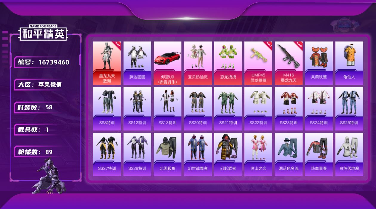 [16739460]苹果 微信-1红装-2粉装-2特效枪-1载具-2.9w热力值-7印记-58套装-89枪皮【热门品类】:套装-胖达圆圆【角色神装等级】:墨龙九天-敖渊(一级)【稀有载具】:仰望U9(赤霞丹朱)【特效枪等级】:M416-墨龙九天(三级),UMP45-恐龙拽拽(七级)【优质套装】:粉装-宝贝奶油派,粉装-恐龙拽拽【优质飞行器】:天之羽翼飞行器,龙翔九天飞行器