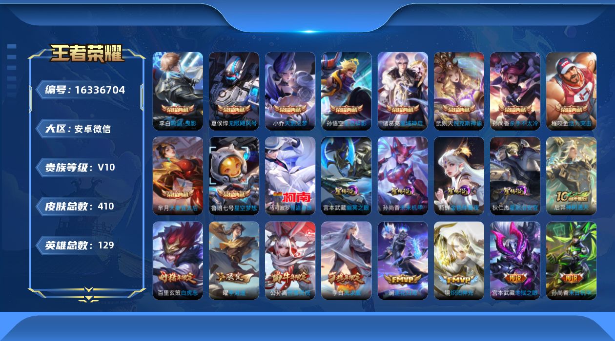 [16336704]安卓WX!!营地被封到26年3月31号!!仓库一个水晶未换!!V10-129英雄-410皮肤-10典藏皮肤-1典藏英雄-1珍品传说-35传说-123史诗 【英雄全皮】:孙权全皮,太乙真人全皮,苏烈全皮,狂铁全皮,蒙恬全皮,影全皮 【荣耀典藏】:武则天英雄,孙悟空全息碎影,武则天倪克斯神谕,夏侯惇无限飓风号,小乔天鹅之梦,孙尚香杀手不太冷,鲁班七号星空梦想,芈月大秦宣太后,程咬金活力突击,李白鸣剑曳影,诸葛亮星域神启 【珍品传说】:马可波罗怪盗基德 【传说皮肤】:后羿神树通天,桑启鸣野蒿,澜逐花归海,艾琳觅芳踪,曜李逍遥 ,周瑜音你心动,小乔音你心动,李元芳飞鸢探春,兰陵王默契交锋,公孙离祈雪灵祝,诸葛亮时雨天司,铠绛天战甲,镜炽阳神光,虞姬启明星使,孙悟空零号赤焰,关羽武圣,曜云鹰飞将,李信一念神魔,刘备时之恋人,貂蝉猫影幻舞,张良黄金白羊座,干将莫邪久胜战神,虞姬云霓雀翎,达摩黄金狮子座,百里玄策白虎志,花木兰冠军飞将,梦奇胖达荣荣,后羿黄金射手座,貂蝉仲夏夜之梦,李白凤求凰,孙尚香末日机甲,宫本武藏地狱之眼,孙悟空地狱火,武则天海洋之心,狄仁杰超时空战士 【限定皮肤】:狄仁杰阴阳师,赵云皇家上将,赵云龙胆,墨子神迹守卫,嬴政优雅恋人,嬴政白昼王子,鲁班七号狮舞东方,鲁班七号乒乒小将,庄周云端筑梦师,高渐离死亡摇滚,高渐离玩趣恶龙,阿轲迷踪丽影,钟无艳王者之锤,钟无艳超时空战士,孙膑天狼运算者,白起夜都怪侠,芈月重明,芈月白晶晶,吕布猎兽之王,吕布御风骁将,周瑜赤莲之焰,元歌云间偶戏,元歌无心,夏侯惇朔风刀,甄姬游园惊梦,甄姬落雪兰心,曹操烛龙,曹操天狼征服者,典韦穷奇,马可波罗逐梦之星,马可波罗暗影游猎,狄仁杰魔术师,狄仁杰万华元夜,达摩星际陆战队,项羽海滩派对,项羽霸王别姬,老夫子醍醐杖,老夫子航海奇遇记,关羽冰锋战神,关羽武圣,程咬金演武夺筹,刘邦夺宝奇兵,王昭君凤凰于飞,王昭君午后时光,兰陵王默契交锋,兰陵王驯魔猎人,兰陵王金庭之子,花木兰默契交锋,亚瑟潮玩骑士王,孙悟空大圣娶亲,孙悟空零号赤焰,孙悟空孙行者,牛魔御旌,牛魔奔雷神使,后羿辉光之辰,后羿圣弓游侠,李元芳银河之约,李元芳云中旅人,虞姬霸王别姬,虞姬启明星使,钟馗神迹守卫,钟馗驱傩正仪,女娲朔望之晖,干将莫邪冰霜恋舞曲,雅典娜单词大作战,雅典娜黎明之约,蔡文姬奇迹圣诞,太乙真人饕餮,太乙真人华