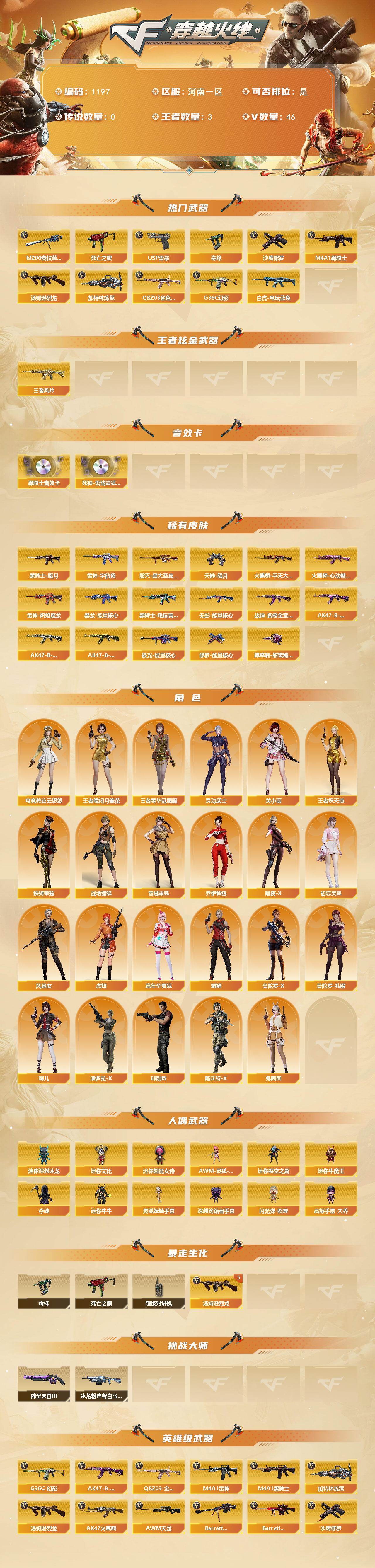 - [17198750]河北一区-82V-3王者-0炫金 【传说武器】:传说破晓 【热门武器】:传说破晓,QBZ03-金色蔷薇,Scar Light-白虎,M200-幻神,白虎-电玩蓝兔,M4A1-黑骑士,加特林-炼狱,斯泰尔-蝴蝶,MK5-炽火炎龙,裁决-雪莉杨,USP-雷暴,炽芒蝶刃*2 【王者炫金武器】:王者星霆 【音效卡】:M200-幻神音效卡,M4A1-黑骑士音效卡,炼狱-百战金芒-庆典舞曲音效卡,死神-雪域霜狐-怀旧音效卡 【皮肤】:幻神-宠儿-2021MVP,幻神-巅峰荣耀,白虎-热带奇洋 皮肤,金色蔷薇-Heartshot皮肤,裁决-胜者为王 皮肤,雷神-暗月,雷神-传奇N9,雷神-宠儿-2019MVP,雷神-维纳斯皮肤,M4A1-再燃火线,火麒麟-百城,火麒麟-心动糖果,毁灭-风暴,毁灭-斗鱼 皮肤,黑龙-墨子皮肤,黑骑士-暗月,黑骑士-电玩青兔皮肤,烈火-动感闪耀 皮肤,战神-紫绶金章皮肤,AK47-B-常胜将军-曹操,AK47-B-常胜将军-刘备,AK47-B-常胜将军-孙权,炼狱-月 皮肤,屠龙-星火燎原,屠龙-春桃 皮肤,轻型军用手斧-再燃火线,擎天-冠军之击 【角色】:鹰,王者樱-热浪之夏,王者影豹,王者空,雪域霜狐,奇洋探员,乔伊教练,云海玲珑,暗夜-X,北极狐-X,初恋灵狐,飞虎队-X,风暴女,虎妞,嘉年华灵狐,娟娟,猎狐者-追月,灵狐-花神,灵狐者-黄金海岸,麻雀,曼陀罗-礼服,潘多拉-X,潘多拉-甜心教官,潜龙队-X,青霞仙子,斯沃特-X,蜀雪,维纳斯,新娜塔莎,雪莉杨-摸金校尉,夜玫瑰-幻能朋克,夜玫瑰-宠粉,游珑儿,智影 【人偶武器】:裁决-雪莉杨,白虎-迷你小艾,MK5-炽火炎龙,斯泰尔-蝴蝶,AWM-灵狐-15周年嘉年华,迷你深渊冰龙,迷你裂空之翼,迷你波特博士,夺魂*2,迷你牛牛,迷你生化手雷,生化手雷-机甲核心*3,深渊终结者手雷,迷你艾比,迷你超能女侍,迷你巨石泰坦-魔花研究所,灵狐娃娃手雷*2 【暴走生化】:超级对讲机 【挑战大师】:神圣爆裂者III*2,AK47-冰龙粉碎者,激光毁灭者III-白马银枪,神圣爆裂者-末日III*2 【英雄级武器】:AK47-火麒麟,M4A1-雷神,M4A1-黑骑士,Scar Light-白虎,无影-神兵利器,QBZ03-云龙,黑武士-锦绣游龙,超新星-热带奇洋,死神-雪域霜狐,QBZ03-金色蔷薇,烈火