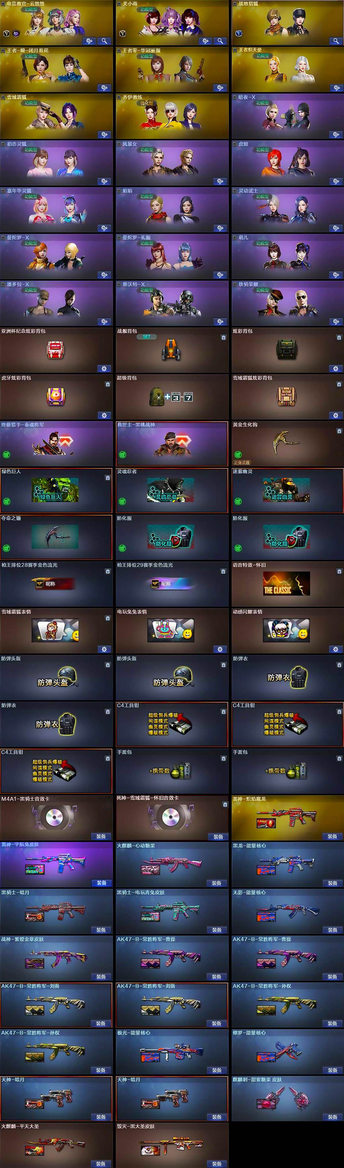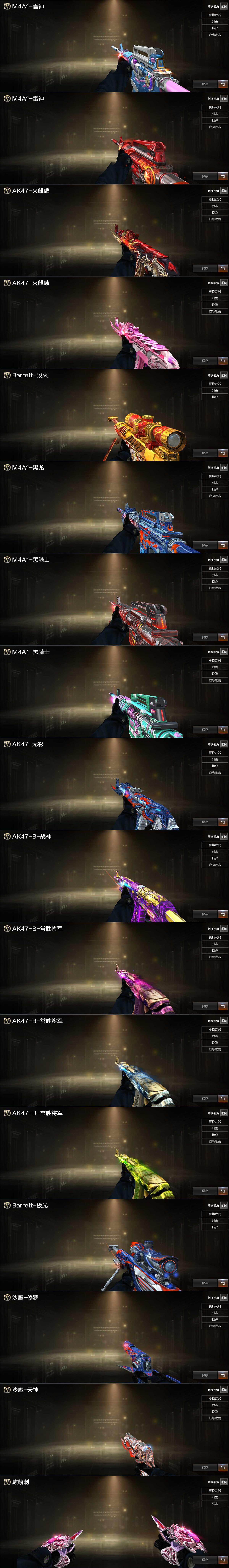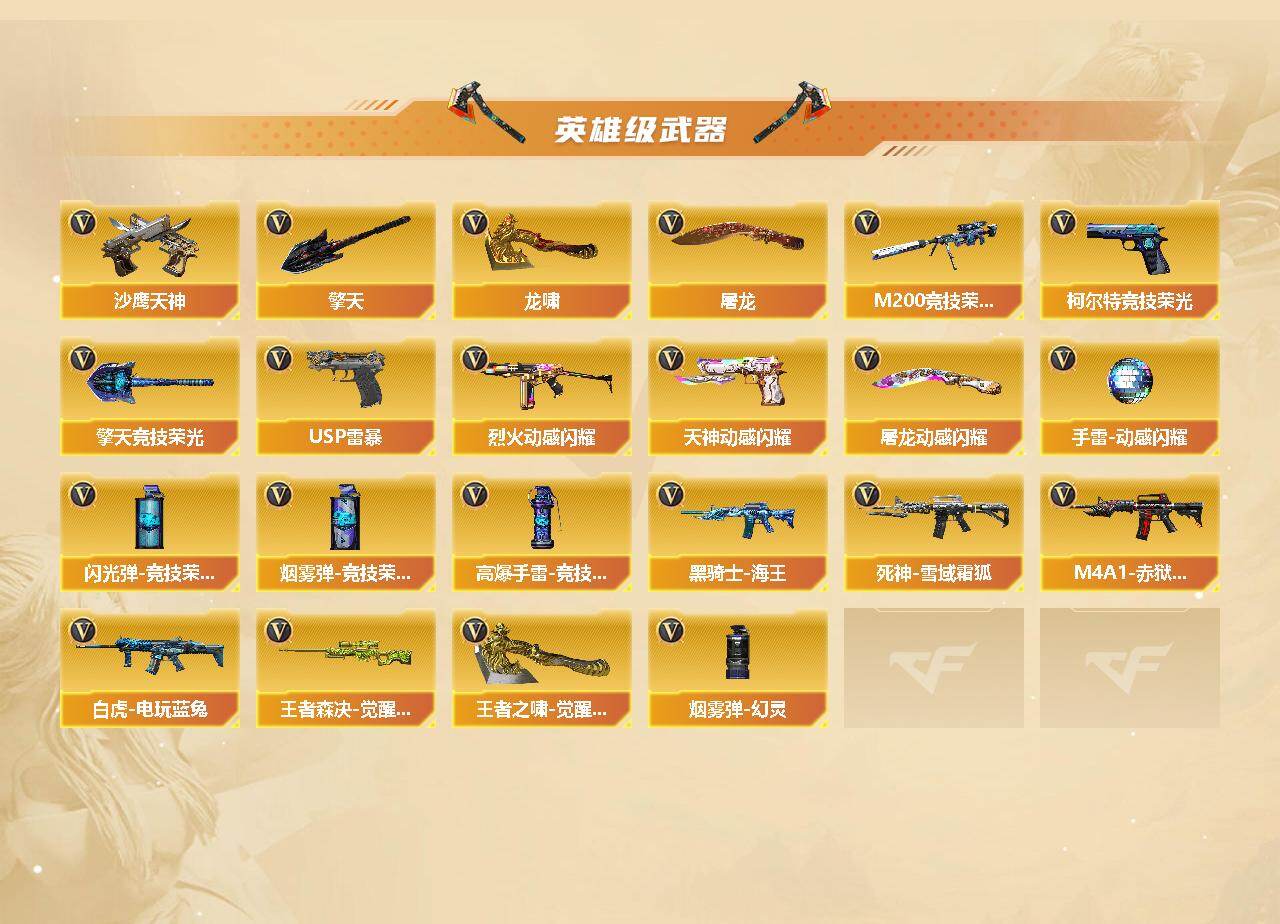 【英雄级武器】:AK47-火麒麟,M4A1-雷神,M4A1-黑骑士,G36C-幻影,死神-雪域霜狐,QBZ03-金色蔷薇,烈火-动感闪耀,黑骑士-海王*2,AK47-B-常胜将军,白虎-电玩蓝兔,AWM-天龙,Barrett-毁灭,Barrett-极光,M200-竞技荣光,王者森决-觉醒版,加特林-炼狱*2,汤姆逊-烈龙*5,沙鹰-修罗*3,沙鹰-天神,USP-雷暴*2,柯尔特-竞技荣光,天神-动感闪耀,屠龙,龙啸,擎天,擎天-竞技荣光,屠龙-动感闪耀,王者之啸-觉醒版,高爆手雷-竞技荣光,手雷-动感闪耀,闪光弹-竞技荣光,烟雾弹-幻灵,烟雾弹-竞技荣光*2,M4A1-赤狱骑士