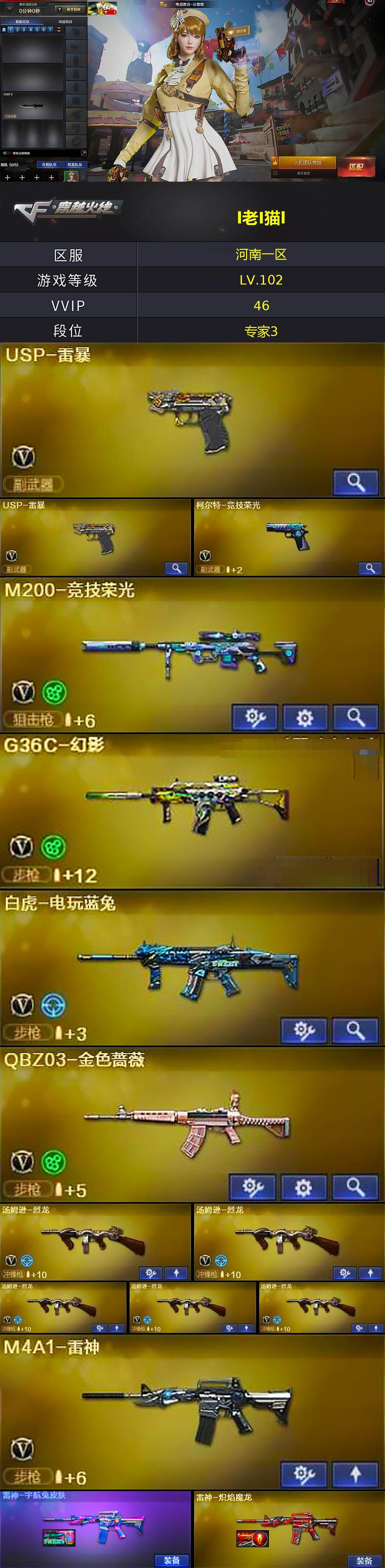 【热门武器】:G36C-幻影,QBZ03-金色蔷薇,M200-竞技荣光,死亡之眼,白虎-电玩蓝兔,毒蜂,M4A1-黑骑士,汤姆逊-烈龙*5,加特林-炼狱*2,USP-雷暴*2,沙鹰-修罗*3