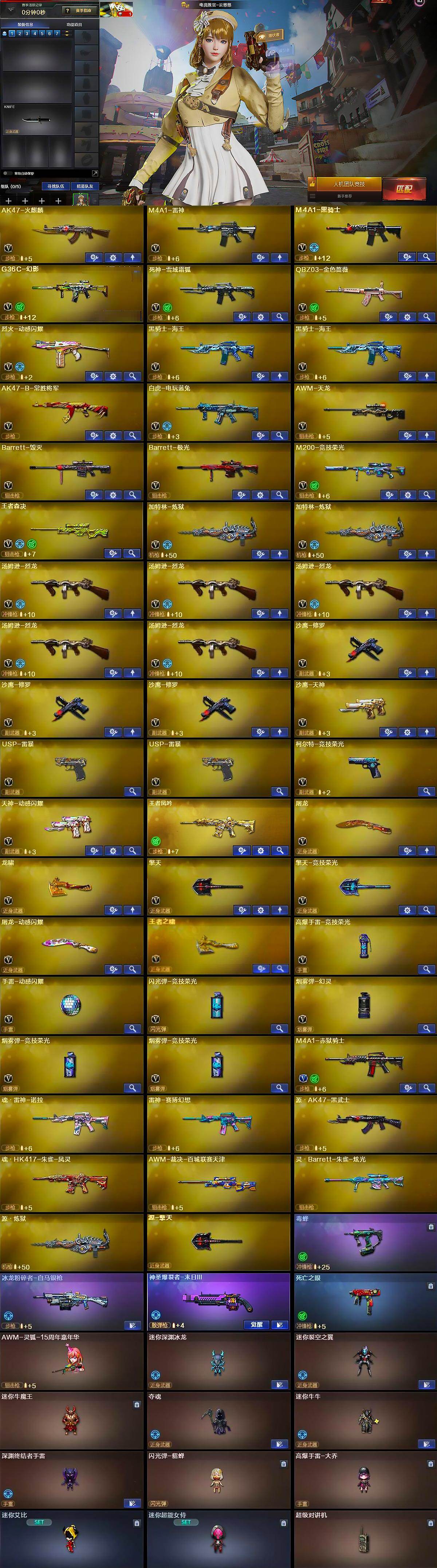 - [16319928]北京一区-46V-5王者-2炫金 【传说武器】:传说灵眸 【热门武器】:传说灵眸,HK417-朱雀,M4A1-青龙*2,M200-幻神*2,白虎-电玩蓝兔,M4A1-黑骑士*2,COP 357-幻灵,沙鹰-修罗*2 【王者炫金武器】:炫金火麒麟,炫金毁灭 【音效卡】:屠龙-动感闪耀 音效卡,M4A1-黑骑士音效卡,Barrett-极光音效卡 【稀有皮肤】:M200-幻神-黄忠皮肤,幻神-巅峰荣耀,幻神-降龙,M200-幻神-荣耀世冠白鲨,幻神-纸灯龙皮肤,白虎-电玩粉兔皮肤,M4A1-战神赵云,火麒麟-平天大圣,火麒麟-心动糖果,黑骑士-暗月,毁灭-冠军之怒,毁灭-黑大圣皮肤 【角色】:王者樱-热浪之夏,王者-迷迭香 【人偶武器】:巴雷特-零-水下丽影,AWM-灵狐-15周年嘉年华,M4A1-雷神-精英刀锋,迷你超能女侍,生化手雷-机甲核心 【暴走生化】:超级对讲机 【挑战大师】:神圣爆裂者-末日III,冰龙粉碎者-白马银枪 【英雄级武器】:COP 357-幻灵,幻灵之锋,烈火-动感闪耀,天神-动感闪耀,屠龙-动感闪耀,手雷-动感闪耀,HK417-朱雀,M4A1-青龙*2,白虎-电玩蓝兔,无影-神兵利器,M4A1-雷神,M4A1-黑骑士*2,AK47-火麒麟*2,AK12-天启,AWM-天龙,Barrett-毁灭,M4A1-龙血,M200-幻神*2,AK47-黑鲨,AK-47-猩红传说*2,AK47-B-战神,沙鹰-修罗*2,麒麟刺*3,屠龙 【特殊枪械】:2黑骑士