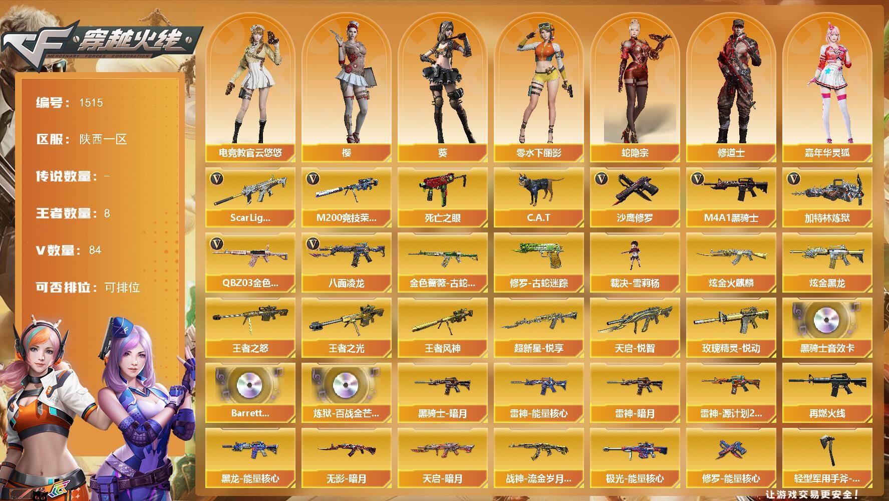 [16493531]陕西一区-84V-8王者-2炫金 【热门武器】:QBZ03-金色蔷薇,Scar Light-白虎,金色蔷薇-古蛇迷踪,修罗-古蛇迷踪,M200-竞技荣光,八面凌龙,死亡之眼,C.A.T,M4A1-黑骑士,加特林-炼狱,裁决-雪莉杨,沙鹰-修罗*4 【王者炫金武器】:超新星-悦享*2,天启-悦智,玫瑰精灵-悦动,王者之光,王者之怒,王者风神,炫金火麒麟,炫金黑龙 【音效卡】:M4A1-黑骑士音效卡,Barrett-碧霄极光音效卡*2,炼狱-百战金芒-庆典舞曲音效卡 【皮肤】:雷神-暗月,雷神-能量核心,雷神-源计划2.0专属 皮肤,M4A1-再燃火线,黑龙-能量核心,黑骑士-暗月*2,无影-暗月,天启-暗月,战神-流金岁月皮肤,极光-能量核心,修罗-能量核心,轻型军用手斧-再燃火线 【角色】:葵,樱,电竞教官-云悠悠,蛇隐宗,修道士,嘉年华灵狐,零-水下丽影,麻雀,潘多拉-X,潘多拉-甜心教官,蛇姬,维纳斯,新娜塔莎,夜玫瑰-宠粉,影武者-X,智影 【人偶武器】:裁决-雪莉杨,M4A1-雷神-精英刀锋,Scar Light-马枪,加特林-机械猎手,AWM-灵狐-15周年嘉年华,C.A.T,迷你深渊冰龙,生化手雷-机甲核心,迷你超能女侍 【暴走生化】:死亡之眼,超级对讲机 【挑战大师】:激光毁灭者III-白马银枪,KAC-圣炎切割者III,神圣爆裂者-末日III 【英雄级武器】:M4A1-千变,AK47-火麒麟,M4A1-黑龙*2,M4A1-雷神*2,M4A1-黑骑士,AK47-无影,M4A1-死神,AK47-黑武士,AK12-天启,M4A1-武圣,AK47-机械迷城*2,M4A1-龙血,Scar Light-白虎,无影-神兵利器,黑武士-锦绣游龙,八面凌龙,金色蔷薇-古蛇迷踪,M4A1-玫瑰精灵,QBZ03-金色蔷薇,M4A1-猎神,王者之戮-觉醒版,AK-47-猩红传说*2,AWM-天龙*2,Barrett-毁灭,Barrett-极光*4,M200-竞技荣光,加特林-炼狱,沙鹰-修罗*4,沙鹰-天神,柯尔特-竞技荣光,Glock18-武圣,修罗-古蛇迷踪,屠龙*3,龙啸,擎天,麒麟刺,擎天-竞技荣光,斩神刀-雷暴,麒麟刺-百战金芒,高爆手雷-竞技荣光*8,高爆手雷-古蛇迷踪,闪光弹-竞技荣光*8,烟雾弹-竞技荣光*9,烟雾弹-古蛇迷踪,M4A1-赤狱骑士,Barr