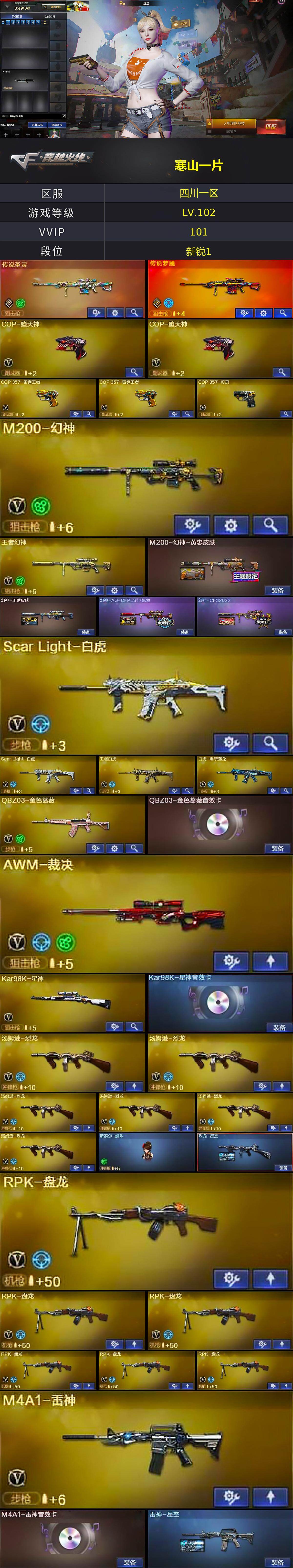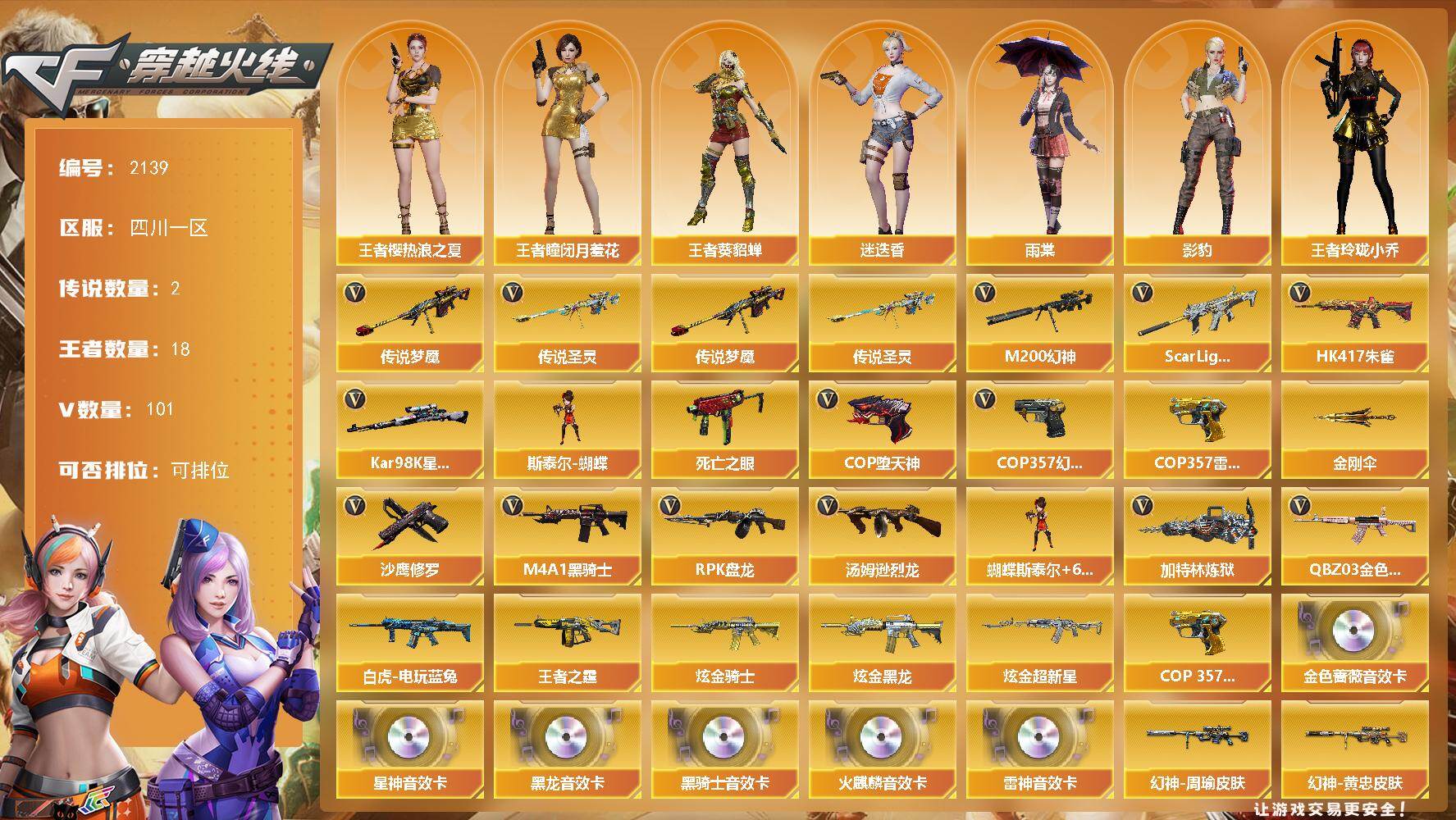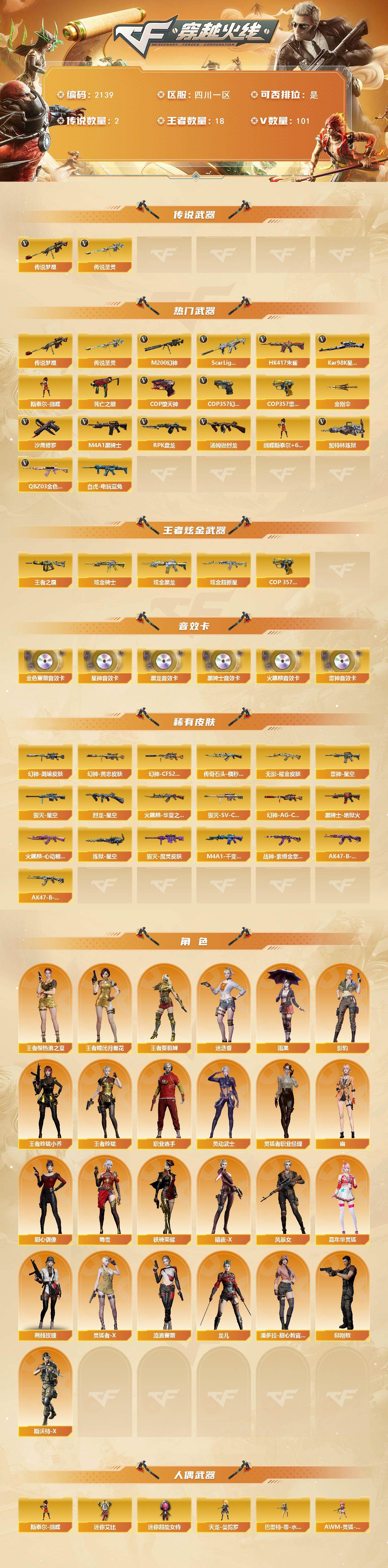 [16811012]四川一区-116V-18王者武器数-3炫金武器数 【传说武器】:传说圣灵,传说梦魇 【热门武器】:传说梦魇,传说圣灵,QBZ03-金色蔷薇,Scar Light-白虎*2,HK417-朱雀,M200-幻神,死亡之眼,白虎-电玩蓝兔,Kar98K-星神,M4A1-黑骑士*6,汤姆逊-烈龙*6,RPK-盘龙*6,加特林-炼狱*2,斯泰尔-蝴蝶,COP-堕天神*2,COP 357-幻灵,COP 357-雷霆王者,沙鹰-修罗,金刚伞 【王者炫金武器】:王者之霆,COP 357-雷霆王者,炫金骑士,炫金黑龙,炫金超新星 【音效卡】:AK47-火麒麟音效卡,M4A1-雷神音效卡,M4A1-黑龙音效卡,M4A1-黑骑士音效卡,QBZ03-金色蔷薇音效卡,Kar98K-星神音效卡 【皮肤】:M200-幻神-黄忠皮肤,幻神-周瑜皮肤,幻神-AG-CFPLS17冠军,幻神-CFS2022,烈龙-星空,雷神-星空,火麒麟-华夏之心,传奇石头-横秒之巅,火麒麟-心动糖果,毁灭-星空,毁灭-SV-CFPLS16冠军,毁灭-魔灵皮肤,M4A1-千变-孔明皮肤,黑骑士-地狱火,无影耀金皮肤*2,战神-紫绶金章皮肤,AK47-B-常胜将军-曹操,AK47-B-常胜将军-刘备*2,炼狱-星空 【角色】:迷迭香,雨棠,影豹,王者-瞳-闭月羞花,王者樱-热浪之夏,王者-葵-貂蝉,王者玲珑,王者玲珑-小乔,暗夜-X,风暴女,嘉年华灵狐,荆棘玫瑰,灵动武士,灵狐者-X,灵狐者-职业经理,流浪蔷薇,龙儿,潘多拉-甜心教官,邱刚敖,斯沃特-X,甜心偶像,蜀雪,铁骑荣耀,幽,职业选手 【人偶武器】:天龙-曼陀罗,斯泰尔-蝴蝶,巴雷特-零-水下丽影,AWM-灵狐-15周年嘉年华,M37-葵,COP-旗袍*2,迷你裂空之翼*2,黄金迷你裂空之翼,夺魂,迷你牛牛*4,迷你生化手雷,深渊终结者手雷,闪光弹-小乔,闪光弹-貂蝉,高爆手雷-大乔,迷你艾比,迷你超能女侍 【暴走生化】:黑龙吞噬者,死亡之眼,超级对讲机 【挑战大师】:暴君乱世-超越Max,AK47-冰龙粉碎者,冰龙粉碎者-白马银枪,激光毁灭者III,机甲撕裂者III 【英雄级武器】:M4A1-千变,AK47-火麒麟,M4A1-黑龙,M4A1-雷神,M4A1-黑骑士*6,AK47-无影,M4A1-死神,AK47-黑武士,AN94-超新星,M4A1-武圣,AK47