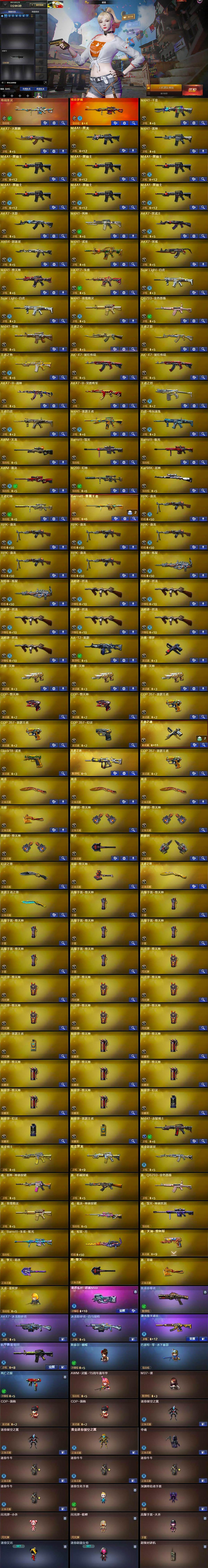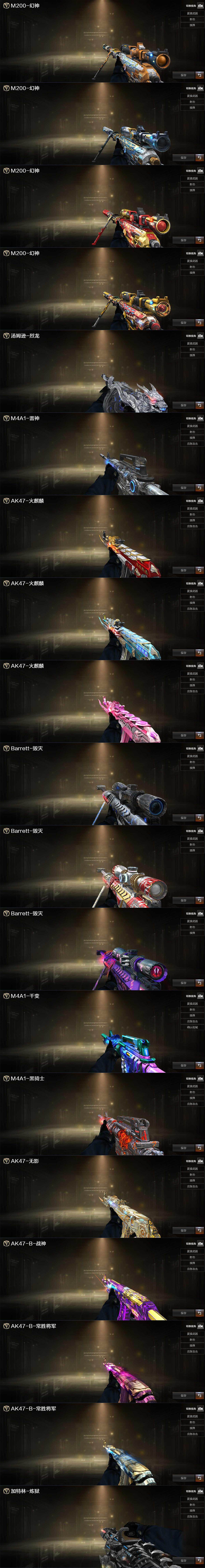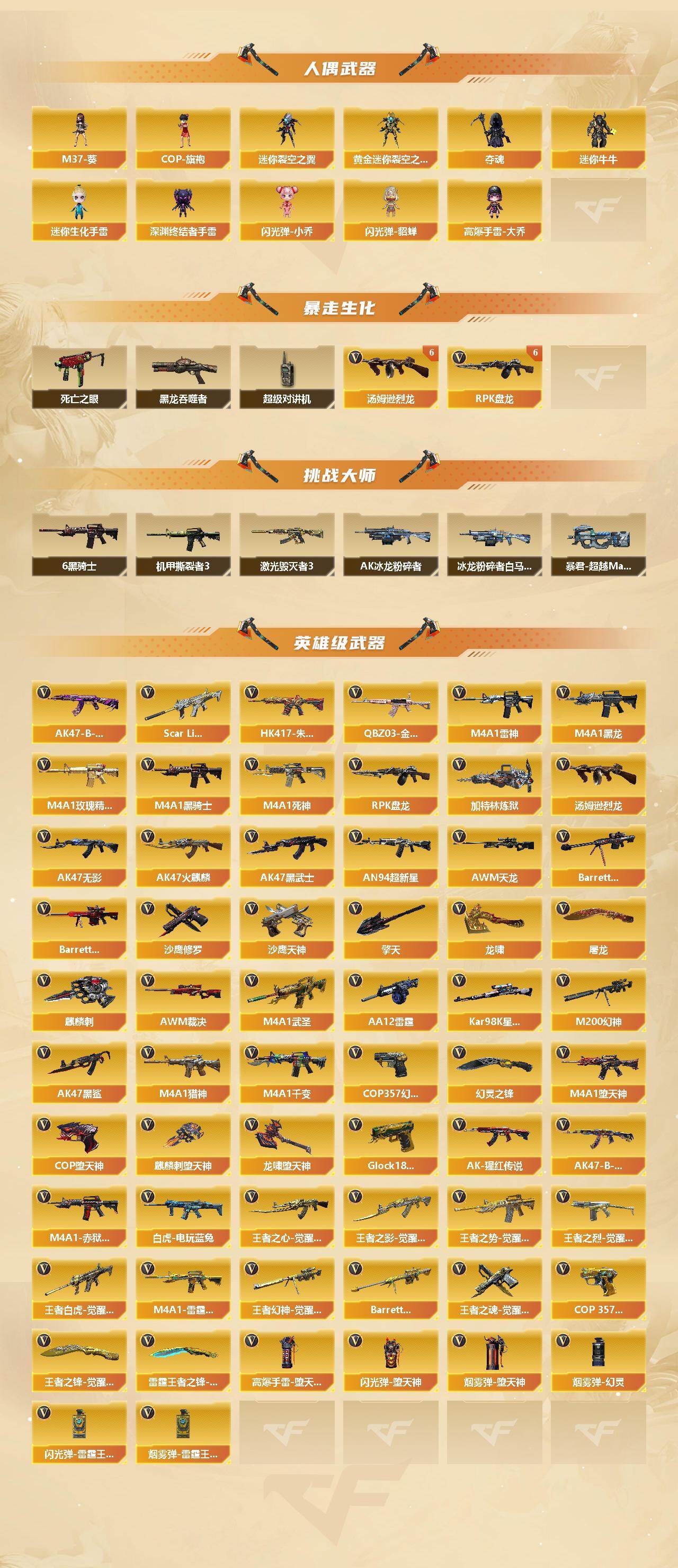 【英雄级武器】:M4A1-千变,AK47-火麒麟,M4A1-黑龙,M4A1-雷神,M4A1-黑骑士*6,AK47-无影,M4A1-死神,AK47-黑武士,AN94-超新星,M4A1-武圣,AK47