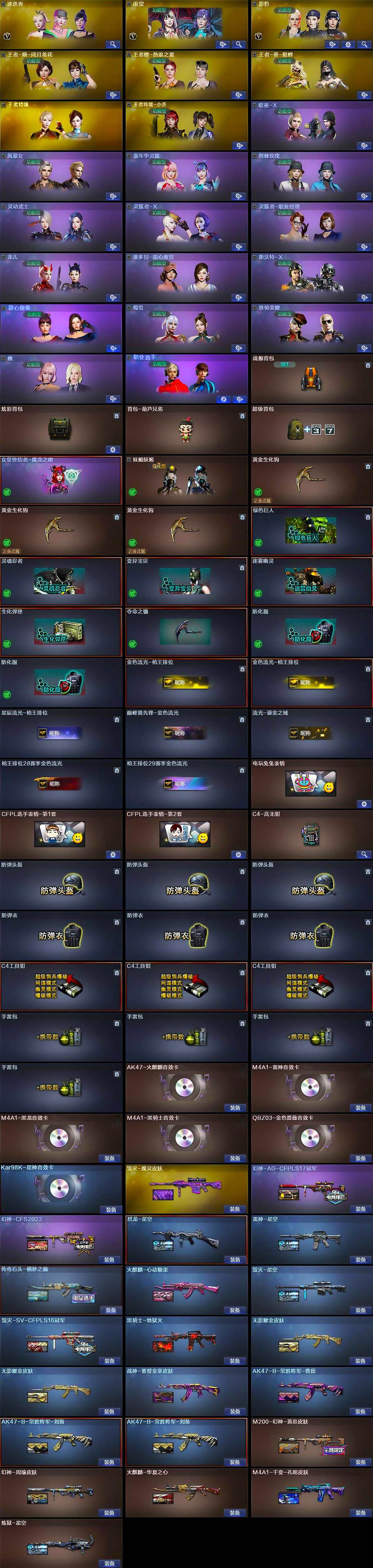 【皮肤】:M200-幻神-黄忠皮肤,幻神-周瑜皮肤,幻神-AG-CFPLS17冠军,幻神-CFS2022,烈龙-星空,雷神-星空,火麒麟-华夏之心,传奇石头-横秒之巅,火麒麟-心动糖果,毁灭-星空,毁灭-SV-CFPLS16冠军,毁灭-魔灵皮肤,M4A1-千变-孔明皮肤,黑骑士-地狱火,无影耀金皮肤*2,战神-紫绶金章皮肤,AK47-B-常胜将军-曹操,AK47-B-常胜将军-刘备*2,炼狱-星空