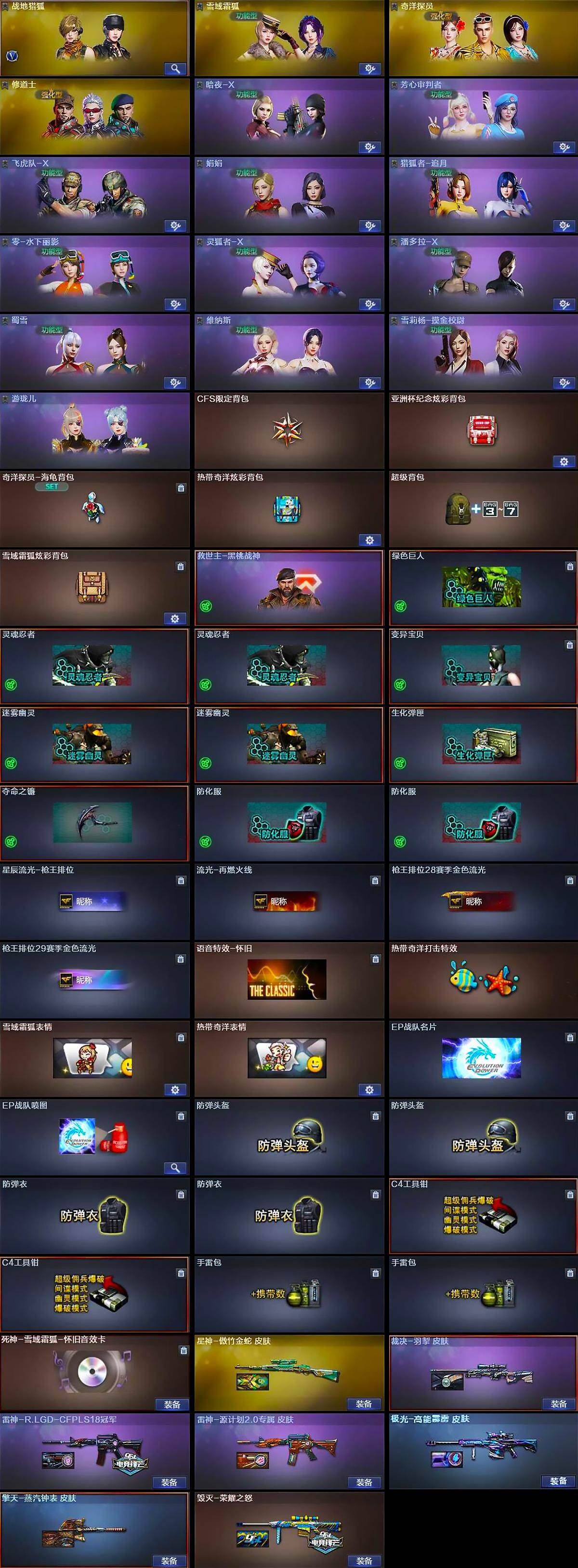 【道具】:CFS限定背包,亚洲杯纪念炫彩背包,奇洋探员-海龟背包,热带奇洋炫彩背包,超级背包,雪域霜狐炫彩背包,救世主-黑桃战神,绿色巨人,灵魂忍者*2,变异宝贝,迷雾幽灵*2,生化弹匣,夺命之镰,防化服*2,星辰流光-枪王排位,流光-再燃火线,枪王排位28赛季金色流光,枪王排位29赛季金色流光,语音特效-怀旧,热带奇洋打击特效,雪域霜狐表情,热带奇洋表情,EP战队名片,EP战队喷图,防弹头盔*2,防弹衣*2,C4工具钳*2,手雷包*2