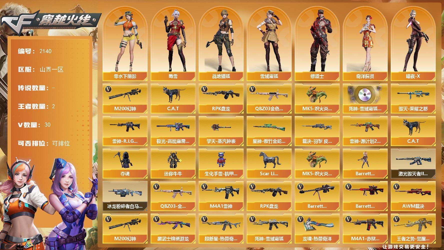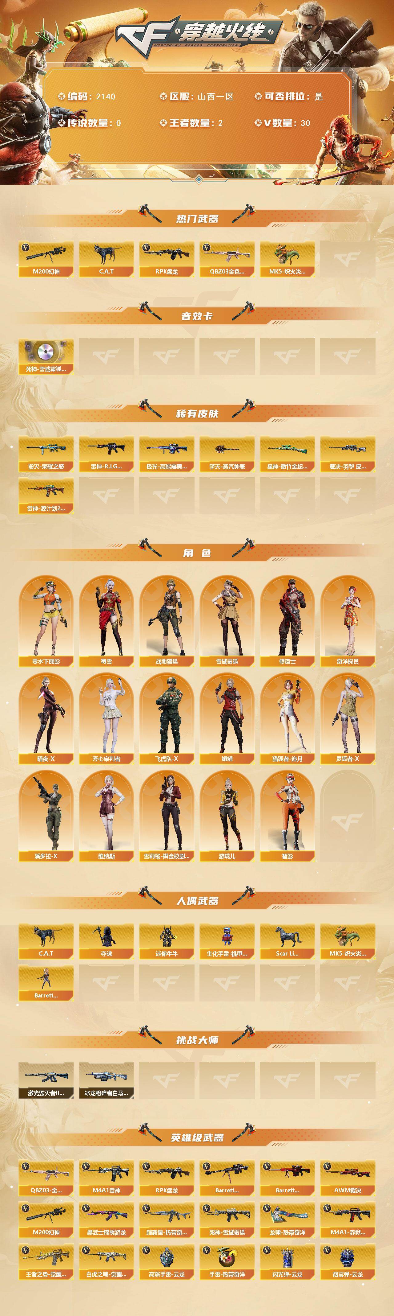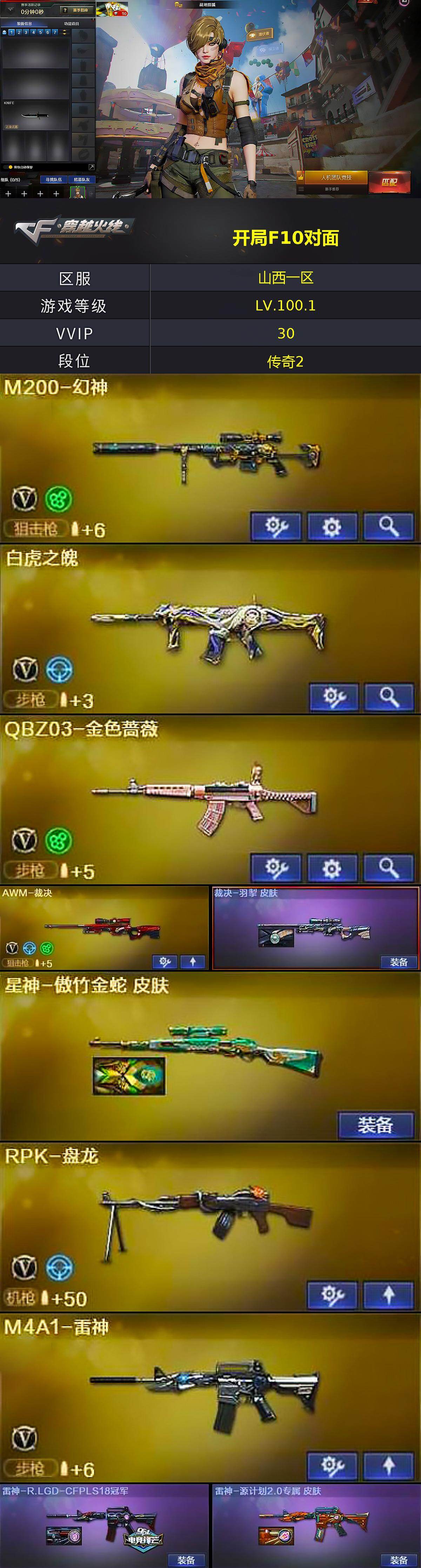 - [14612504]61V/100级/元帅/2王者/3炫金/3英雄/QBZ03-金色蔷薇/M200-幻神/死亡之眼/白虎-电玩蓝兔/M4A1-黑骑士/汤姆逊-烈龙/RPK-盘龙/加特林-炼狱/沙鹰-修罗/王者之力/炫金黑骑士/炫金千变/炫金天神/M200-幻神音效卡/Barrett-毁灭音效卡/炼狱-百战金芒-庆典舞曲音效卡/幻神周瑜/AWM-裁决-凤灵皮肤/裁决-运输船 皮肤/雷神-暗月/雷神-星空/M4A1-再燃火线/雷神-神秘按键 皮肤/毁灭-暗月/毁灭耀金皮肤/毁灭-英雄计划 皮肤/黑龙-墨子皮肤/黑骑士-耀金皮肤/轻型军用手斧-再燃火线/葵/战地猎狐/堕落女神/暗夜-X/初恋灵狐/风暴女/娟娟/兰-海滩派对/龙儿-小淘气/潘多拉-X/新灵狐者/樱-战斗天使/AWM-灵狐-15周年嘉年华/生化手雷-机甲核心/超级对讲机/6烈龙/AK47-火麒麟/M4A1-黑龙/M4A1-雷神/AK47-黑武士/AK12-天启/AN94-超新星/M4A1-武圣/AK47-黑鲨/M4A1-玫瑰精灵/AWM-天龙/Barrett-毁灭/AWM-裁决/Barrett-金色蔷薇/炼狱-百战金芒/Glock18-武圣/屠龙/龙啸/擎天/麒麟刺/麒麟刺-百战金芒/高爆手雷-竞技荣光/闪光弹-竞技荣光/烟雾弹-竞技荣光/M4A1-赤狱骑士/BS战队炫彩背包/炫彩背包/百战金芒炫彩背包/女皇终结者-魔龙之吻/救世主-黑桃战神/绿色巨人/灵魂忍者/妖姬/迷雾幽灵/夺命之镰/防化服/流光-鎏金之域/流光-再燃火线/枪王排位29赛季金色流光/语音特效-盛典烟火/萌萌小葵表情/炽雪表情/防弹头盔/防弹衣/C4工具钳/手雷包