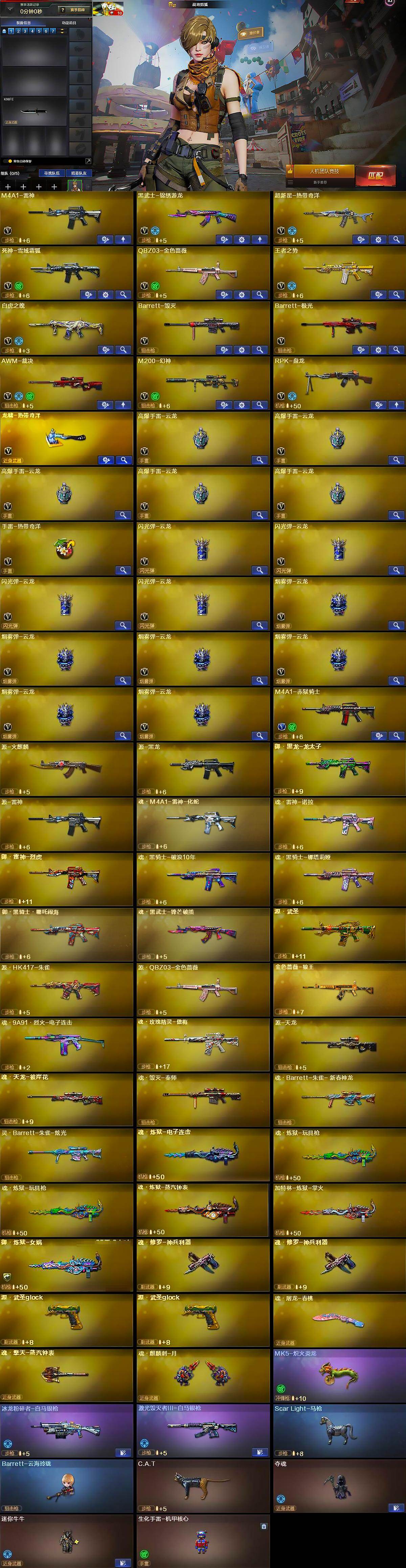 - [16619146]专家S-2英雄角色数-146英雄武器数 【热门武器】:KSG-孟获,81式-光明之神,M4A1-星象,AWM-游骑兵*2,COP 357-雷霆 【角色】:葵,零-新生 【英雄武器】:AK47-火麒麟,AK47-血武士,AK47-华夏传说,AK47-木兰*2,AK47-谜城烟火,M4A1-雷神,M4A1-黑骑士,M4A1-死神*2,M4A1-星象,M4A1-龙血,M4A1-机械迷城,M4A1-赛博雷神,M4A1-海骑士,M4A1-运输船,M4A1-太白诗仙,SCAR-探星者,SCAR-心动PICK,AN94-赳赳秦师,FAMAS-湮灭,9A91-天神,9A91-魔蜥觉醒,M14EBR-天神,M14EBR-拂影,M16-恶魔,QBZ03-金色蔷薇,QBZ03-玉面羞花,81式-光明之神,G36-机械纪元,QBZ191-封神榜,AWM-游骑兵*2,AWM-裁决,AWM-指南针觉醒,AWM-指南针,AWM-大湾溢彩,巴雷特-毁灭*2,巴雷特-极光*2,09式狙-天神,QBB95-极光,汤姆逊-烈龙,CZS2-心动次元,PP19野牛-造纸术,地狱火,KSG-孟获,USP-机械迷城,沙鹰-修罗*2,沙鹰-火麒麟,沙鹰-天神,气手枪-血月,沙鹰-宇航兔兔,改装GLOCK-木兰*2,双持GLOCK18-本初,GLOCK18-猎神,COP 357-雷霆,QSZ92-华夏传说,女皇利刃-铁胆虎魄,炽芒蝶刃,匕首-浩瀚征途,血阳,手斧-机械迷城,秋逸,屠龙,尼泊尔-竞界荣光,麒麟刺*3,马来剑-毁灭,唐刀-华夏传说*2,唐刀-大唐荣耀*2,擎天,斩魔刀,破邪蛇棍觉醒,马来剑-耀金伯爵,火麒麟手雷,手雷-竞界荣光*3,雷神手雷,高爆手雷-无限,闪光弹-游骑兵*2,黑骑士闪光弹,火麒麟闪光弹,雷神闪光弹,烟雾弹-游骑兵*2,火麒麟烟雾弹,雷神烟雾弹,烟雾弹-星际宇航,燃烧弹-游骑兵