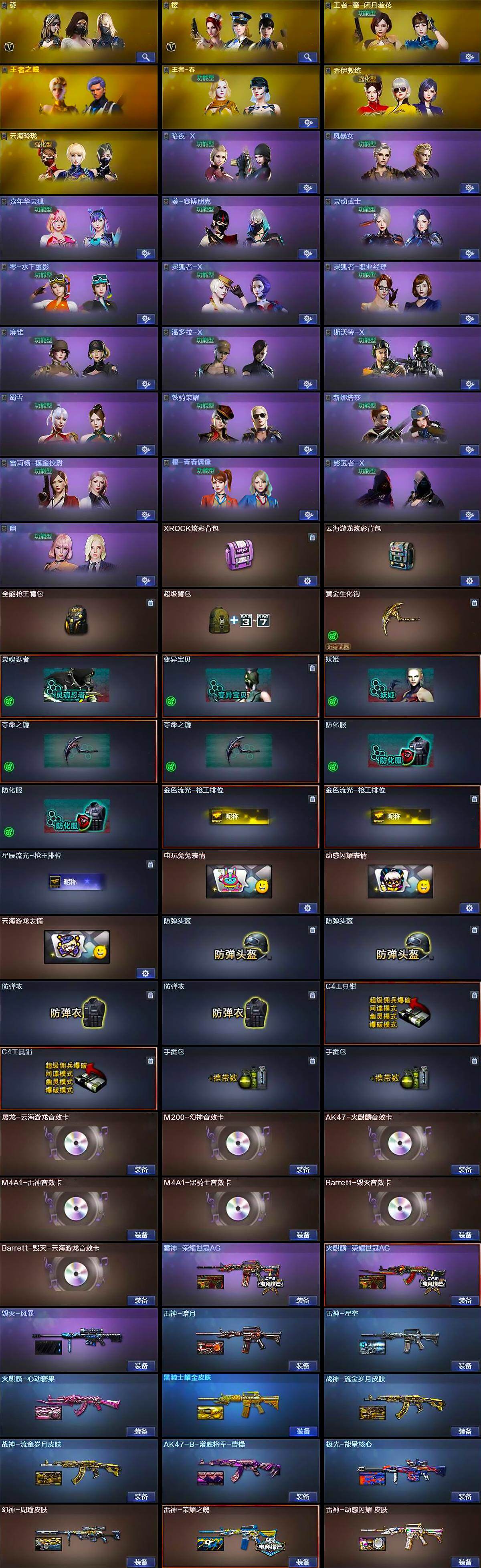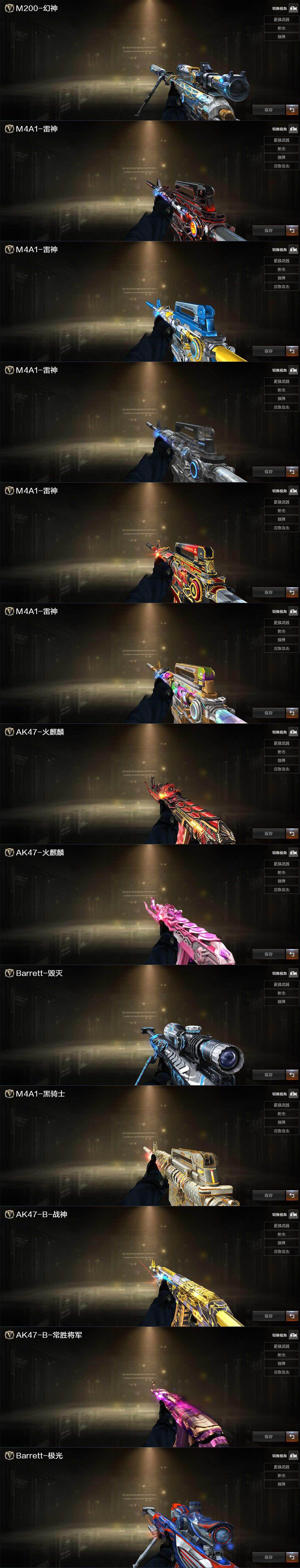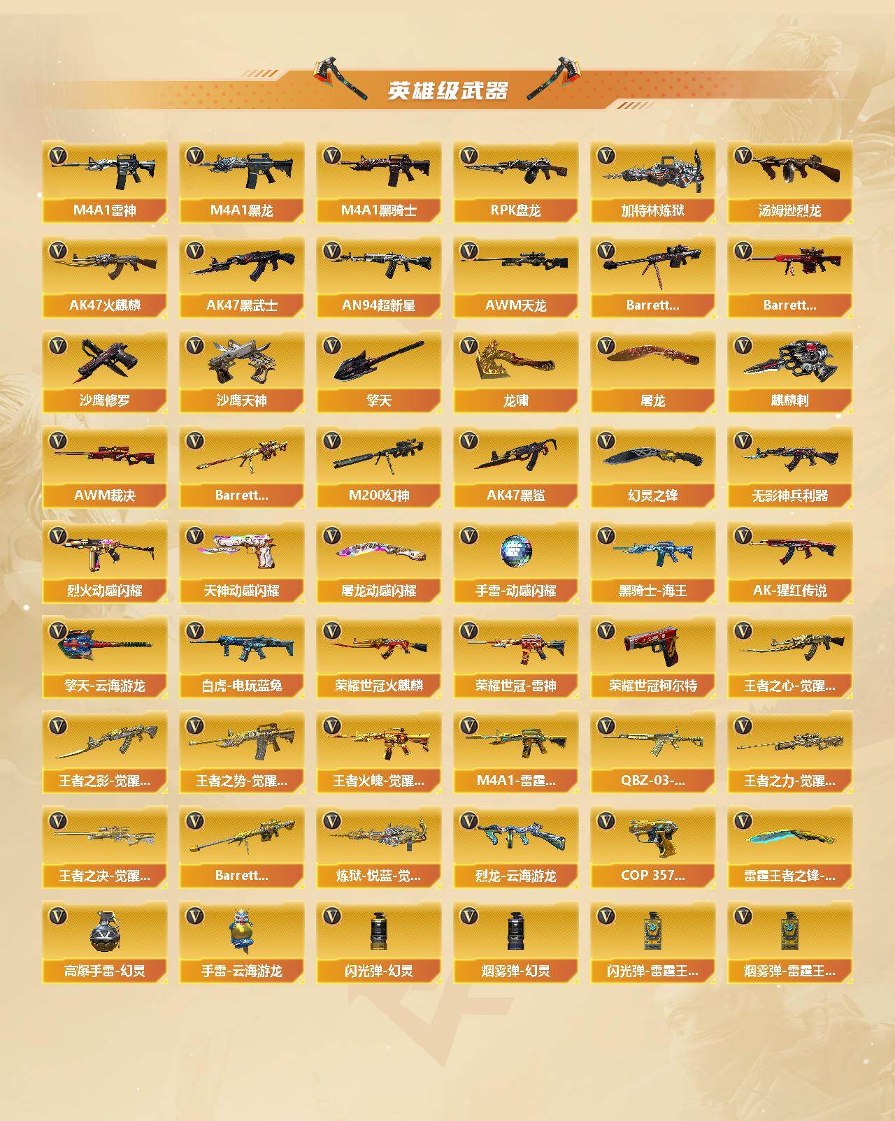 【英雄级武器】:AK47-火麒麟*2,M4A1-黑龙,M4A1-雷神*3,M4A1-黑骑士,AK47-黑武士,AN94-超新星,AK47-黑鲨,无影-神兵利器,烈火-动感闪耀,王者之心-觉醒版,王者之影-觉醒版,王者之势-觉醒版,AK-47-猩红传说*2,王者火魄-觉醒版,黑骑士-海王,M4A1-雷霆王者-觉醒版,QBZ-03-王者蔷薇-觉醒版,白虎-电玩蓝兔,荣耀世冠-火麒麟,荣耀世冠-雷神,AWM-天龙,Barrett-毁灭,Barrett-极光,AWM-裁决,M200-幻神,Barrett-朱雀,王者之力-觉醒版,王者之决-觉醒版,Barrett-雷霆王者-觉醒版,RPK-盘龙*6,加特林-炼狱*4,炼狱-悦蓝-觉醒版,汤姆逊-烈龙*7,烈龙-云海游龙,沙鹰-修罗,沙鹰-天神,COP 357-雷霆王者-觉醒版