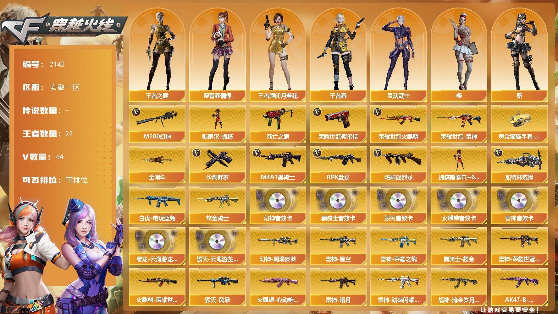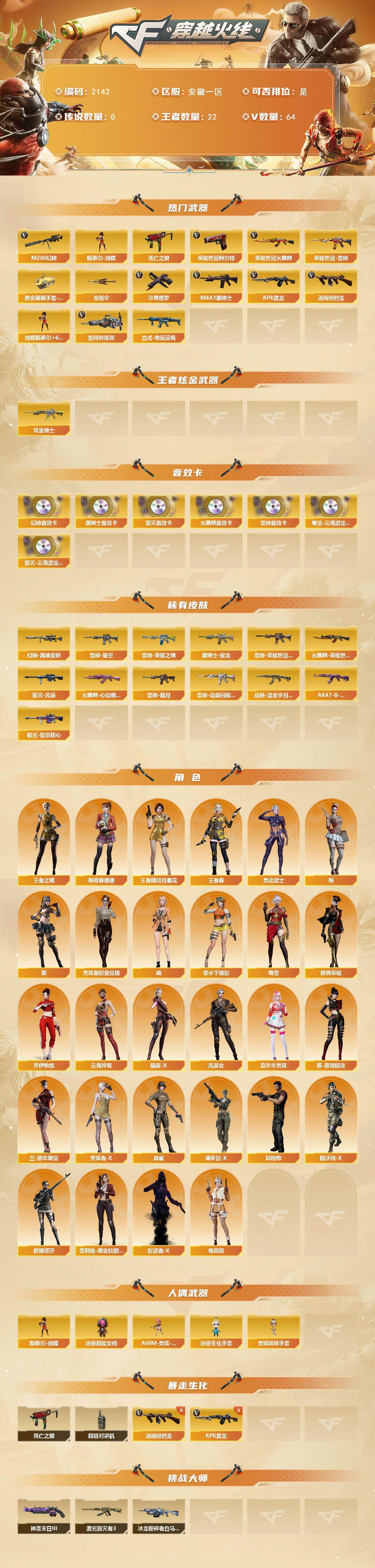 [16814807]安徽一区-84V-22王者武器数-1炫金武器数 【热门武器】:M200-幻神,死亡之眼,荣耀世冠-火麒麟,荣耀世冠-雷神,白虎-电玩蓝兔,荣耀世冠-柯尔特,M4A1-黑骑士,汤姆逊-烈龙*7,RPK-盘龙*6,加特林-炼狱*4,斯泰尔-蝴蝶,沙鹰-修罗,黄金猫猫手套-白鲨,金刚伞 【王者炫金武器】:炫金骑士 【音效卡】:屠龙-云海游龙音效卡,M200-幻神音效卡,AK47-火麒麟音效卡,M4A1-雷神音效卡,M4A1-黑骑士音效卡,Barrett-毁灭音效卡,Barrett-毁灭-云海游龙音效卡 【皮肤】:幻神-周瑜皮肤,雷神-暗月,雷神-荣耀之魄,雷神-星空,雷神-荣耀世冠AG,雷神-动感闪耀 皮肤,火麒麟-荣耀世冠AG,火麒麟-心动糖果,毁灭-风暴,黑骑士耀金皮肤,战神-流金岁月皮肤*2,AK47-B-常胜将军-曹操,极光-能量核心 【角色】:葵,樱,王者-瞳-闭月羞花,王者之瞳,王者春,乔伊教练,云海玲珑,暗夜-X,风暴女,嘉年华灵狐,葵-赛博朋克,兰-新年限定,灵动武士,零-水下丽影,灵狐者-X,灵狐者-职业经理,麻雀,潘多拉-X,邱刚敖,斯沃特-X,蜀雪,铁骑荣耀,兔囡囡,新娜塔莎,雪莉杨-摸金校尉,樱-青春偶像,影武者-X,幽 【人偶武器】:斯泰尔-蝴蝶,AWM-灵狐-15周年嘉年华,迷你生化手雷,迷你超能女侍,灵狐娃娃手雷 【暴走生化】:死亡之眼,超级对讲机 【挑战大师】:冰龙粉碎者-白马银枪,激光毁灭者III*2,神圣爆裂者-末日III 【英雄级武器】:AK47-火麒麟*2,M4A1-黑龙,M4A1-雷神*3,M4A1-黑骑士,AK47-黑武士,AN94-超新星,AK47-黑鲨,无影-神兵利器,烈火-动感闪耀,王者之心-觉醒版,王者之影-觉醒版,王者之势-觉醒版,AK-47-猩红传说*2,王者火魄-觉醒版,黑骑士-海王,M4A1-雷霆王者-觉醒版,QBZ-03-王者蔷薇-觉醒版,白虎-电玩蓝兔,荣耀世冠-火麒麟,荣耀世冠-雷神,AWM-天龙,Barrett-毁灭,Barrett-极光,AWM-裁决,M200-幻神,Barrett-朱雀,王者之力-觉醒版,王者之决-觉醒版,Barrett-雷霆王者-觉醒版,RPK-盘龙*6,加特林-炼狱*4,炼狱-悦蓝-觉醒版,汤姆逊-烈龙*7,烈龙-云海游龙,沙鹰-修罗,沙鹰-天神,COP 357-雷霆王者-觉醒版