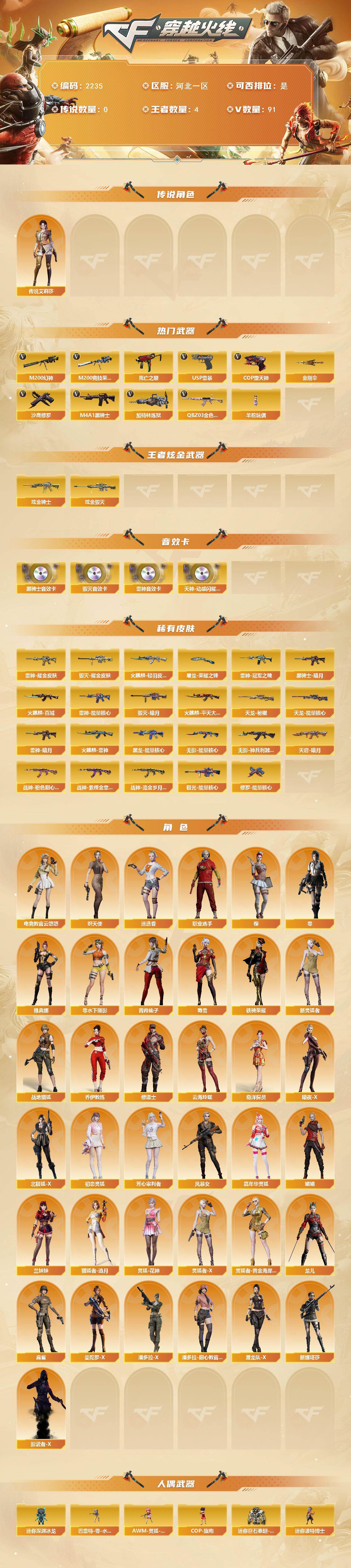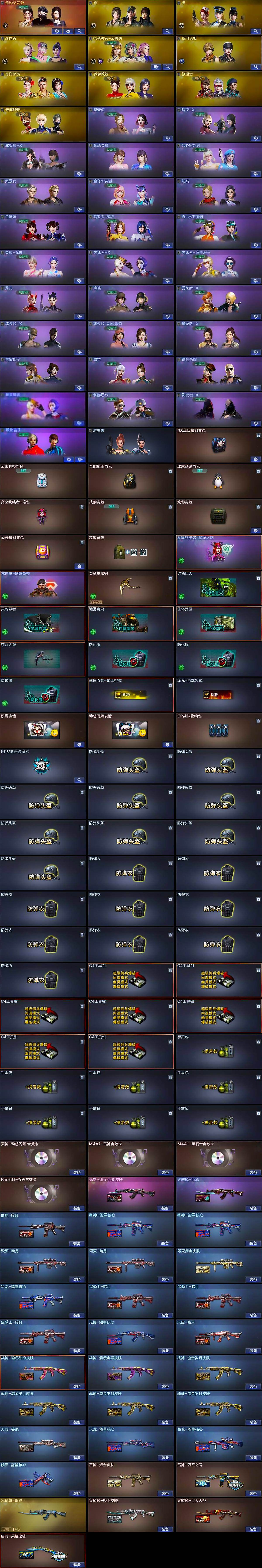 - [16849490]南方大区-36V-3王者-1炫金 【热门武器】:M200-幻神,金色蔷薇-古蛇迷踪,修罗-古蛇迷踪,M4A1-黑骑士,羊驼玩偶,裁决-雪莉杨 【王者炫金武器】:炫金火麒麟 【音效卡】:炼狱-百战金芒-庆典舞曲音效卡,死神-雪域霜狐-怀旧音效卡 【皮肤】:幻神-电竞之星 皮肤,M4A1-再燃火线,毁灭-星空,毁灭-英雄计划 皮肤,M4A1-千变-孔明皮肤,AWM-再燃火线,轻型军用手斧-再燃火线,擎天-傲竹金蛇 皮肤 【角色】:隼,战地猎狐,雪域霜狐,蛇隐宗,乔伊教练,修道士,暗夜-X,兰妹妹,0号玩家,蛇姬,兔囡囡,智影 【人偶武器】:裁决-雪莉杨,COP-旗袍,生化手雷-机甲核心*3,Barrett-夜玫瑰 【挑战大师】:冰龙粉碎者-白马银枪 【英雄级武器】:M4A1-黑龙,M4A1-雷神,M4A1-黑骑士,AN94-超新星,金色蔷薇-古蛇迷踪,Barrett-毁灭,AWM-裁决,M200-幻神,炼狱-百战金芒,沙鹰-天神*2,修罗-古蛇迷踪,屠龙*2,擎天-竞技荣光,麒麟刺-百战金芒,高爆手雷-竞技荣光*4,高爆手雷-古蛇迷踪,闪光弹-竞技荣光*4,闪光弹-雷霆王者-觉醒版,烟雾弹-竞技荣光*4,烟雾弹-古蛇迷踪,烟雾弹-雷霆王者-觉醒版,M4A1-赤狱骑士,M4A1-苍鸣雷神 【道具】:BS战队炫彩背包,CFS限定背包,EP战队炫彩背包,云山科技背包,亚洲杯纪念炫彩背包,古蛇迷踪炫彩背包,炫彩背包-诺拉,牛魔王背包-至尊黄金,百战金芒炫彩背包,超级背包,雪域霜狐炫彩背包,女皇终结者-魔龙之吻,救世主-黑桃战神,黄金生化钩,绿色巨人,灵魂忍者*2,变异宝贝,迷雾幽灵*2,夺命之镰,防化服*3,流光-鎏金之域,流光-再燃火线,枪王排位28赛季金色流光,枪王排位29赛季金色流光,语音特效-盛典烟火,语音特效-怀旧,古蛇迷踪打击特效,雪域霜狐表情,蛇隐宗表情,萌萌小葵表情,防弹头盔*3,防弹衣*3,C4工具钳*3,手雷包*3 【特殊枪械】:1黑骑士