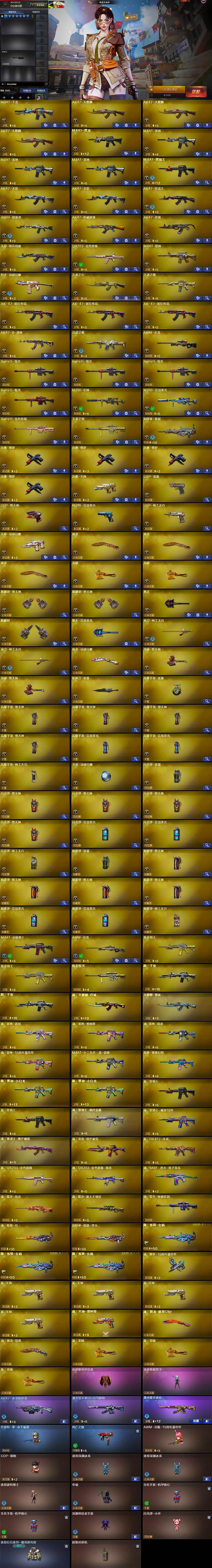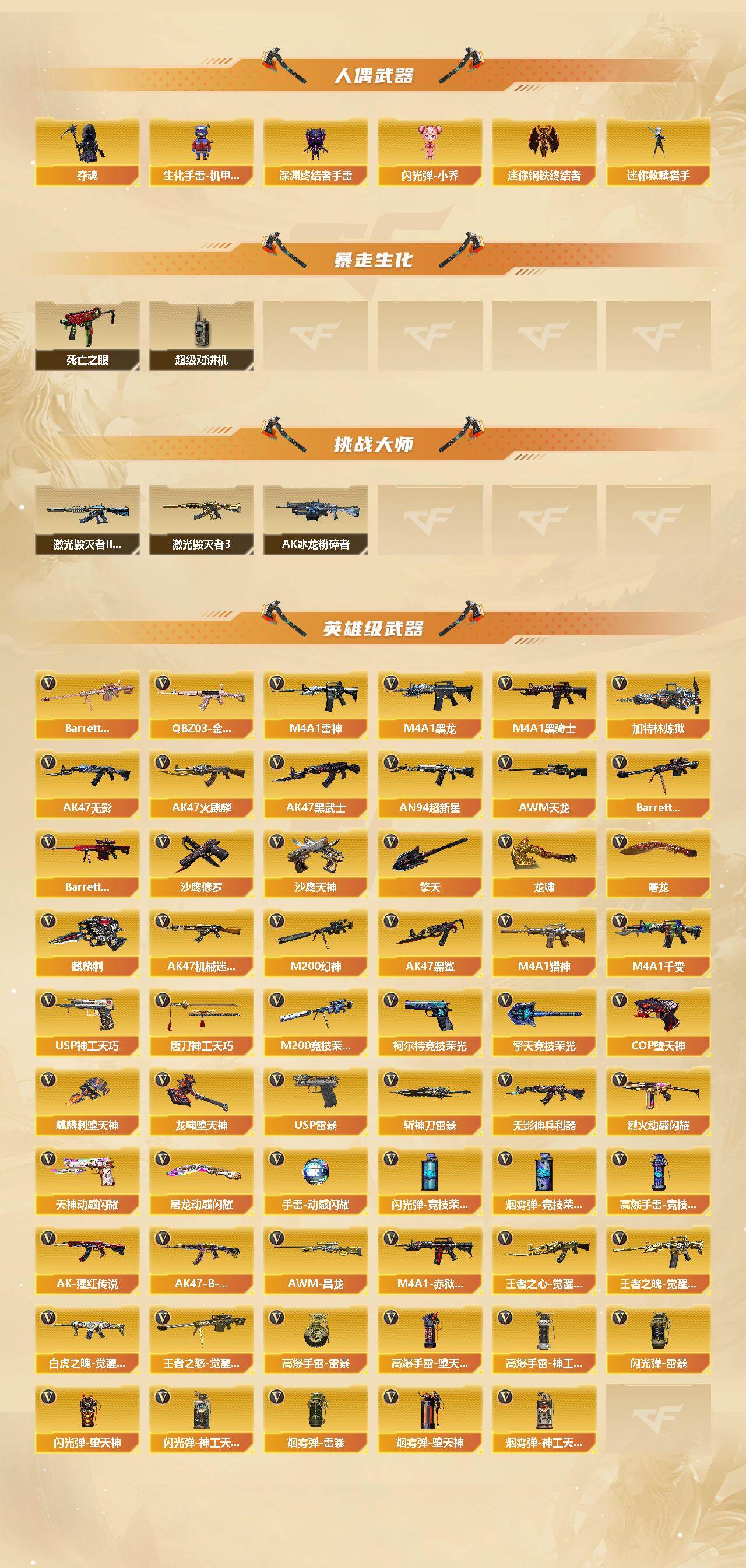 【英雄级武器】:M4A1-千变,AK47-火麒麟*3,M4A1-黑龙,M4A1-雷神*3,M4A1-黑骑士,AK47-无影*2,AK47-黑武士,AN94-超新星,AK47-机械迷城,AK47-黑鲨,无影-神兵利器,QBZ03-金色蔷薇,M4A1-猎神,烈火-动感闪耀,王者之心-觉醒版,王者之魄-觉醒版,AK-47-猩红传说*3,AK47-B-战神,白虎之魄-觉醒版,AWM-天龙,Barrett-毁灭*3,Barrett-极光,M200-幻神,M200-竞技荣光,