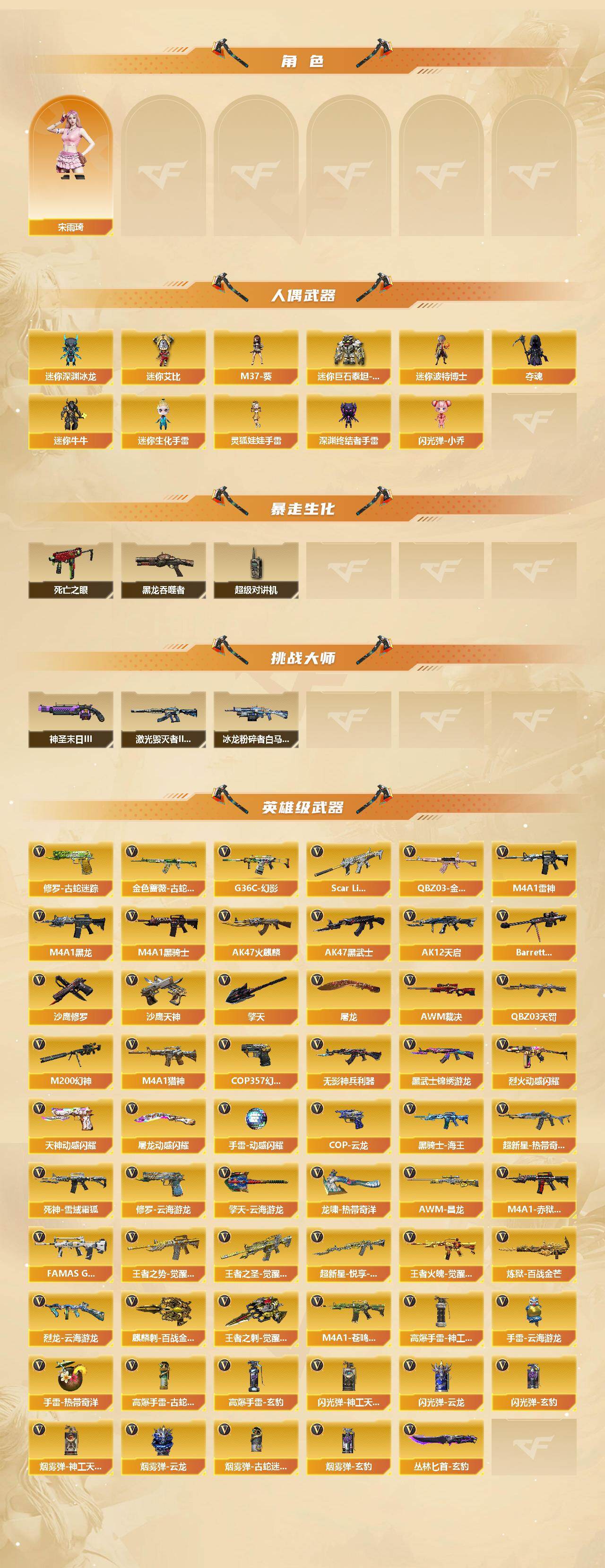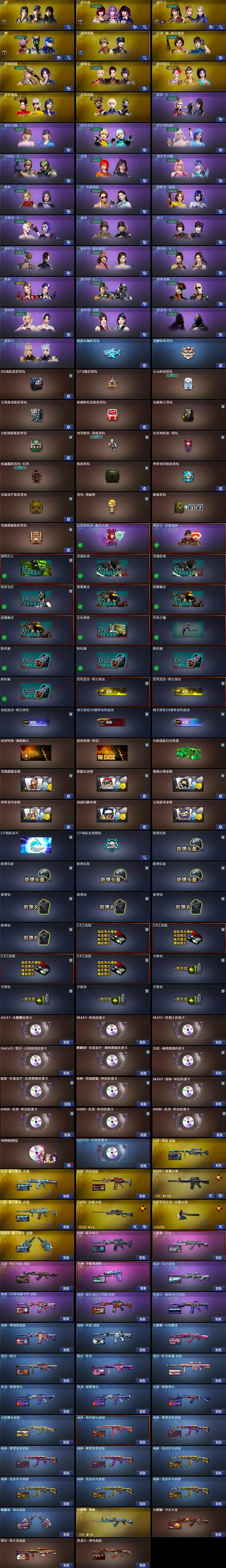 【音效卡】:AK47-火麒麟音效卡,M4A1-黑龙音效卡,M4A1-黑骑士音效卡,Barrett-毁灭-云海游龙音效卡,宋雨琦语音包,QBZ03-天罚音效卡,麒麟刺-百战金芒-盛典舞曲音效卡,白虎-盛典舞曲音效卡,炼狱-百战金芒-庆典舞曲音效卡,死神-雪域霜狐-怀旧音效卡,M4A1-雷神-怀旧音效卡,AWM-昌龙-怀旧音效卡*3