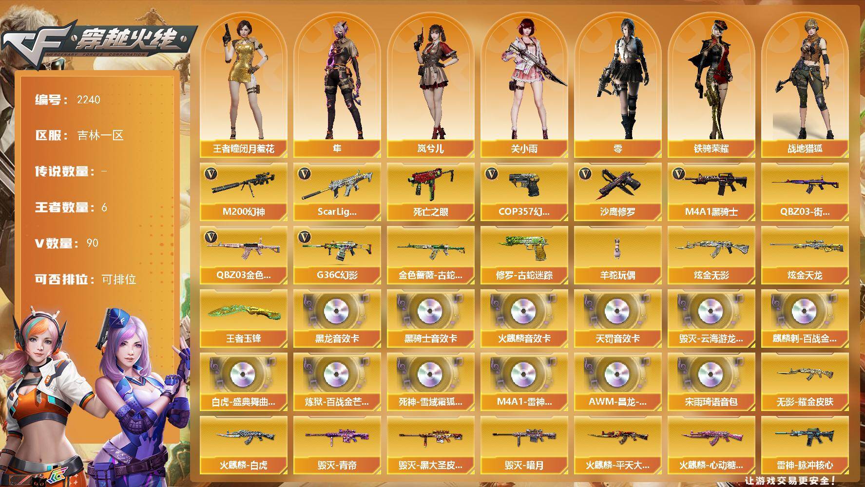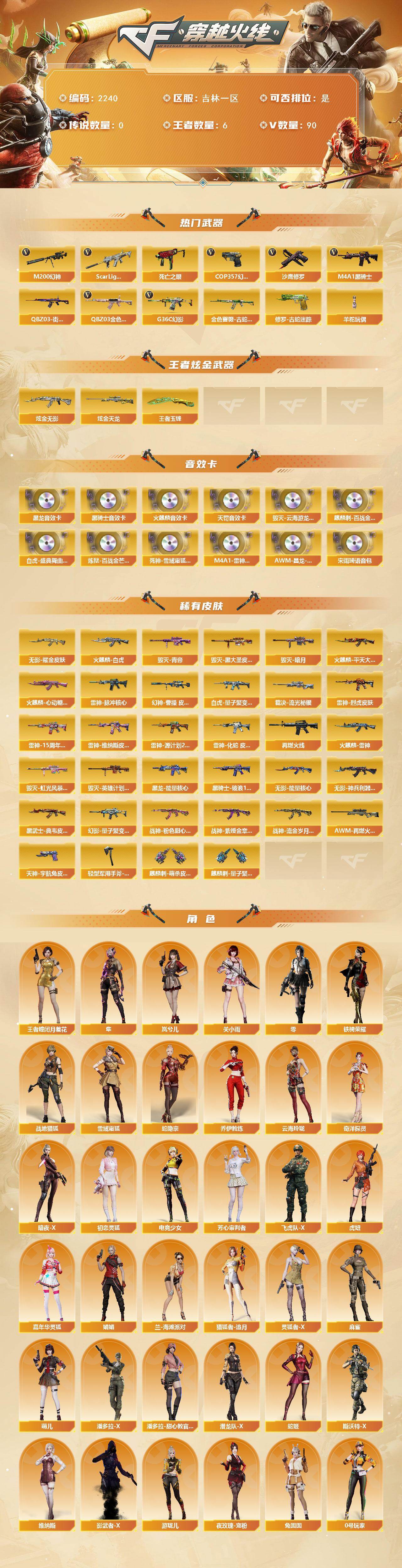 [17036708]吉林一区-89V-6王者武器数-2炫金武器数 【热门武器】:G36C-幻影,QBZ03-金色蔷薇,Scar Light-白虎,M200-幻神,金色蔷薇-古蛇迷踪,修罗-古蛇迷踪,死亡之眼*2,QBZ03-街机,M4A1-黑骑士,羊驼玩偶,COP 357-幻灵,沙鹰-修罗*3 【王者炫金武器】:王者玉锋,炫金无影,炫金天龙 【音效卡】:AK47-火麒麟音效卡,M4A1-黑龙音效卡,M4A1-黑骑士音效卡,Barrett-毁灭-云海游龙音效卡,宋雨琦语音包,QBZ03-天罚音效卡,麒麟刺-百战金芒-盛典舞曲音效卡,白虎-盛典舞曲音效卡,炼狱-百战金芒-庆典舞曲音效卡,死神-雪域霜狐-怀旧音效卡,M4A1-雷神-怀旧音效卡,AWM-昌龙-怀旧音效卡*3 【皮肤】:幻神-曹操 皮肤,白虎-量子聚变 皮肤,裁决-流光秘银,雷神-烈虎皮肤,雷神-脉冲核心,雷神-15周年嘉年华 皮肤,雷神-维纳斯皮肤,雷神-源计划2.0专属 皮肤,雷神-化蛇 皮肤,M4A1-再燃火线,火麒麟-雷神,火麒麟-平天大圣,火麒麟-白虎,火麒麟-心动糖果,毁灭-暗月,毁灭-黑大圣皮肤,毁灭-青帝,毁灭-虹光风暴 皮肤,毁灭-英雄计划 皮肤,黑龙-能量核心*2,黑骑士-破浪10年皮肤,无影-能量核心,无影耀金皮肤,无影-神兵利器 皮肤,黑武士-典韦皮肤,幻影-量子聚变 皮肤,战神-粉色甜心皮肤,战神-紫绶金章皮肤*3,战神-流金岁月皮肤*4,AWM-再燃火线,天神-宇航兔皮肤,轻型军用手斧-再燃火线,麒麟刺-萌杀皮肤,麒麟刺-量子聚变 皮肤 【角色】:零,关小雨,岚兮儿,隼,战地猎狐,王者-瞳-闭月羞花,雪域霜狐,蛇隐宗,奇洋探员,乔伊教练,云海玲珑,宋雨琦,暗夜-X,初恋灵狐,电竞少女,芳心审判者,飞虎队-X,虎妞,嘉年华灵狐,娟娟,兰-海滩派对,猎狐者-追月,0号玩家,灵狐者-X,麻雀,萌儿,潘多拉-X,潘多拉-甜心教官,潜龙队-X,蛇姬,斯沃特-X,铁骑荣耀,兔囡囡,维纳斯,夜玫瑰-宠粉,影武者-X,游珑儿 【人偶武器】:M37-葵,迷你深渊冰龙*2,迷你波特博士,夺魂,迷你牛牛*2,迷你生化手雷,深渊终结者手雷,闪光弹-小乔,迷你艾比,迷你巨石泰坦-魔花研究所,灵狐娃娃手雷 【暴走生化】:黑龙吞噬者,死亡之眼*2,超级对讲机 【挑战大师】:冰龙粉碎者-白马银枪*2,激光毁灭者III-白马银枪*2