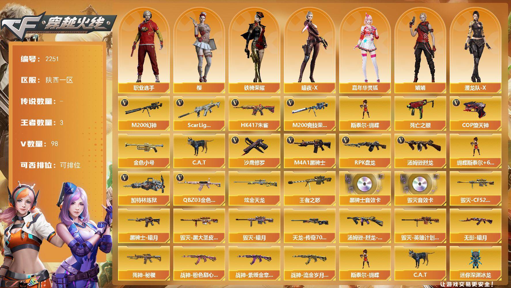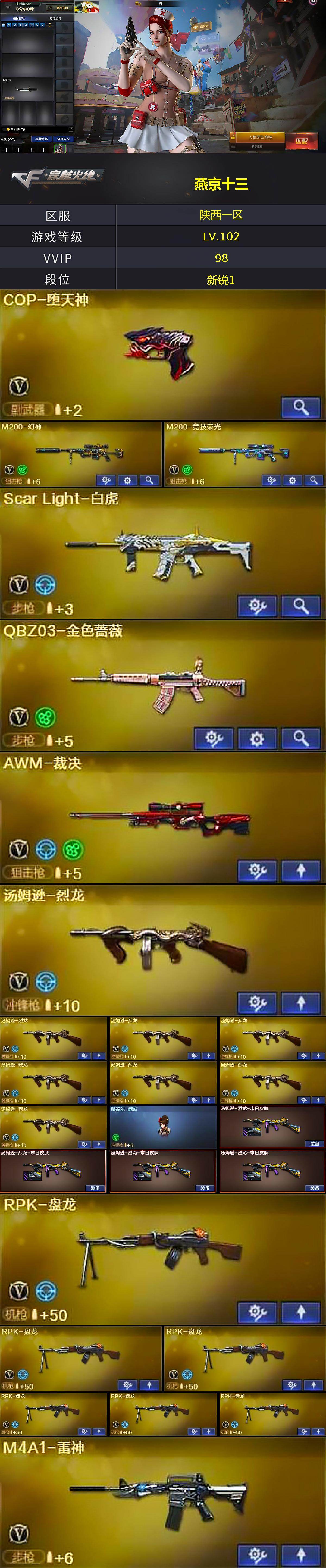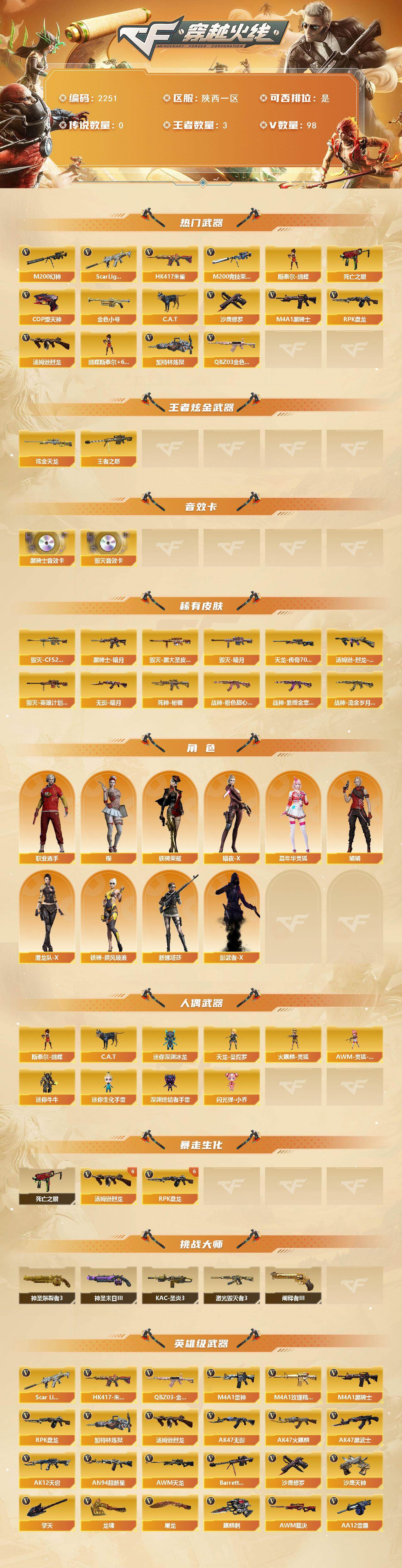 [17036775]陕西一区-101V-3王者武器数-1炫金武器数 【热门武器】:QBZ03-金色蔷薇,Scar Light-白虎,HK417-朱雀,M200-幻神,M200-竞技荣光,死亡之眼,金色小号,C.A.T,M4A1-黑骑士*4,汤姆逊-烈龙*8,RPK-盘龙*6,加特林-炼狱,斯泰尔-蝴蝶,COP-堕天神,沙鹰-修罗*3 【王者炫金武器】:王者之怒,炫金天龙 【音效卡】:M4A1-黑骑士音效卡,Barrett-毁灭音效卡 【皮肤】:汤姆逊-烈龙-末日皮肤*4,毁灭-暗月,毁灭-CFS2020,毁灭-黑大圣皮肤,毁灭-英雄计划 皮肤,黑骑士-暗月*2,无影-暗月,死神-秘银,战神-粉色甜心皮肤*3,战神-紫绶金章皮肤*8,战神-流金岁月皮肤*3,AWM-天龙-传奇70KG 【角色】:樱,暗夜-X,嘉年华灵狐,娟娟,潜龙队-X,铁骑-乘风破浪,铁骑荣耀,新娜塔莎,影武者-X,职业选手 【人偶武器】:天龙-曼陀罗,火麒麟-灵狐,斯泰尔-蝴蝶,AWM-灵狐-15周年嘉年华,C.A.T,迷你深渊冰龙,迷你牛牛*4,迷你生化手雷,深渊终结者手雷*3,闪光弹-小乔 【暴走生化】:死亡之眼 【挑战大师】:神圣爆裂者III,激光毁灭者III,KAC-圣炎切割者III,神圣爆裂者-末日III*2,阐释者III*2 【英雄级武器】:AK47-火麒麟,M4A1-雷神,M4A1-黑骑士*4,AK47-无影,AK47-黑武士*2,AK12-天启,AN94-超新星,HK417-朱雀,Scar Light-白虎,无影-神兵利器,M4A1-玫瑰精灵,QBZ03-金色蔷薇,AK-47-猩红传说*11,AK47-B-战神,黑骑士-海王,AWM-天龙*2,Barrett-毁灭,AWM-裁决,M200-幻神,M200-竞技荣光,王者之怒-觉醒版,RPK-盘龙*6,加特林-炼狱,汤姆逊-烈龙*8,AA-12-雷霆,沙鹰-修罗*3,沙鹰-天神,COP-堕天神,屠龙*2,龙啸,马来剑-夜魔,擎天*4,麒麟刺,擎天-竞技荣光,斩神刀-雷暴,王者之锋-觉醒版,高爆手雷-雷暴*3,高爆手雷-夜魔,高爆手雷-竞技荣光*3,闪光弹-雷暴*3,闪光弹-夜魔,闪光弹-竞技荣光*5,烟雾弹-雷暴*3,烟雾弹-夜魔,烟雾弹-竞技荣光*5 【道具】:超级背包,绿色巨人,灵魂忍者,迷雾幽灵,夺命之镰,防化服*2,金色流光-枪王排位,C4-沙
