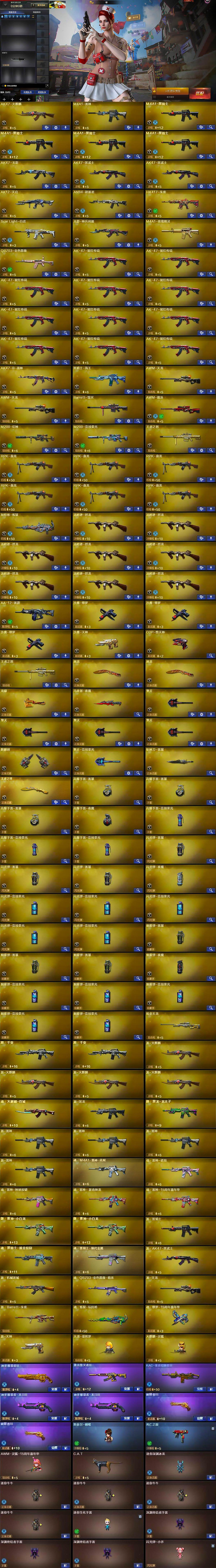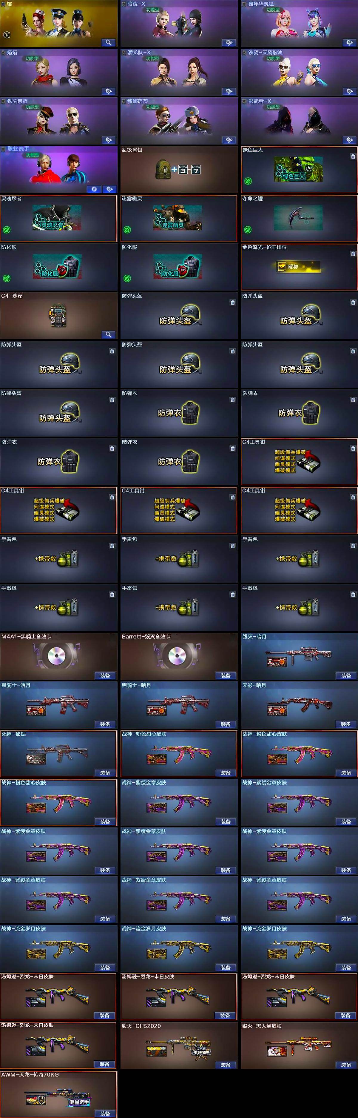 【英雄级武器】:AK47-火麒麟,M4A1-雷神,M4A1-黑骑士*4,AK47-无影,AK47-黑武士*2,AK12-天启,AN94-超新星,HK417-朱雀,Scar Light-白虎,无影-神兵利器,M4A1-玫瑰精灵,QBZ03-金色蔷薇,AK-47-猩红传说*11,AK47-B-战神,黑骑士-海王,AWM-天龙*2,Barrett-毁灭,AWM-裁决,M200-幻神,M200-竞技荣光,王者之怒-觉醒版,RPK-盘龙*6,加特林-炼狱,汤姆逊-烈龙*8,AA-12-雷霆,沙鹰-修罗*3,沙鹰-天神,COP-堕天神,屠龙*2,龙啸,马来剑-夜魔,擎天*4,麒麟刺,擎天-竞技荣光,斩神刀-雷暴,王者之锋-觉醒版,高爆手雷-雷暴*3,高爆手雷-夜魔,高爆手雷-竞技荣光*3,闪光弹-雷暴*3,闪光弹-夜魔,闪光弹-竞技荣光*5,烟雾弹-雷暴*3,烟雾弹-夜魔,烟雾弹-竞技荣光*5