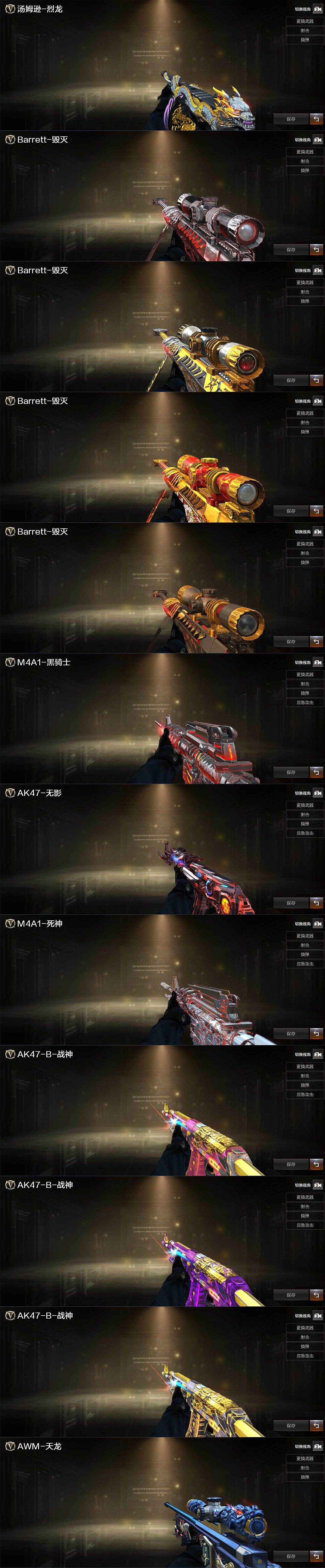 【热门武器】:QBZ03-金色蔷薇,Scar Light-白虎,HK417-朱雀,M200-幻神,M200-竞技荣光,死亡之眼,金色小号,C.A.T,M4A1-黑骑士*4,汤姆逊-烈龙*8,RPK-盘龙*6,加特林-炼狱,斯泰尔-蝴蝶,COP-堕天神,沙鹰-修罗*3