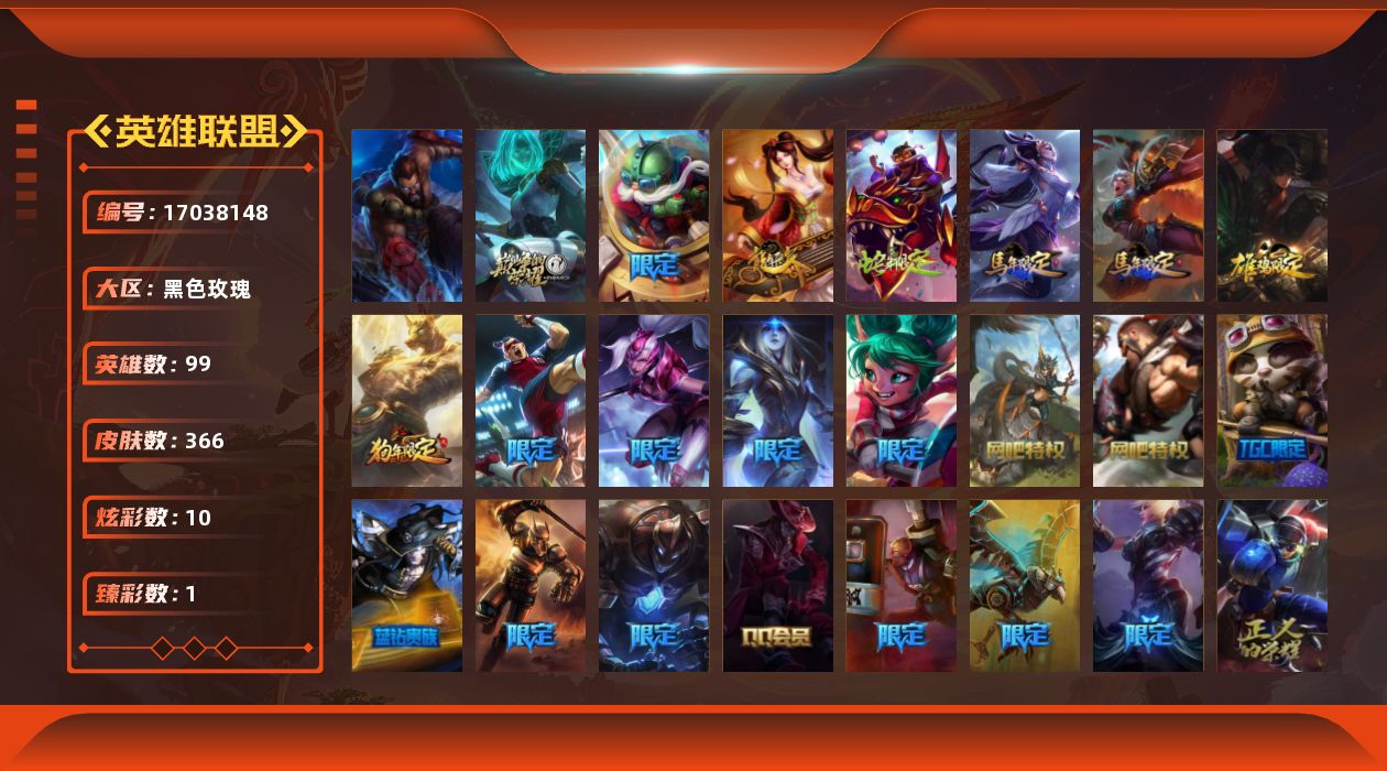 [17038148]未定级段位-99英雄-366皮肤-10炫彩-1终极-1神话-61限定-30传说-98史诗
