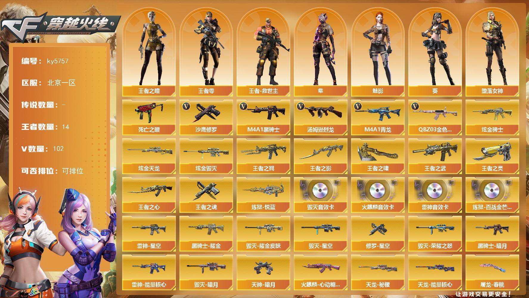 [17038489]北京一区-109V-14王者武器数-5炫金武器数 【热门武器】:QBZ03-金色蔷薇*3,M4A1-青龙,死亡之眼,M4A1-黑骑士*4,汤姆逊-烈龙*6,沙鹰-修罗*4 【王者炫金武器】:王者之戮*2,王者之武,王者之影,王者之心,炼狱-悦蓝,王者之灵,王者之魂,王者之啸,炫金骑士,炫金毁灭*3,炫金天龙 【音效卡】:AK47-火麒麟音效卡,M4A1-雷神音效卡,Barrett-毁灭音效卡,炼狱-百战金芒-庆典舞曲音效卡 【皮肤】:幻神-电竞之星 皮肤,AWM-裁决-百城联赛天津皮肤,AWM-裁决-凤灵皮肤,裁决-胜者为王 皮肤,雷神-暗月,雷神-能量核心,雷神-星空,雷神-机甲刑天皮肤,雷神-维纳斯皮肤,雷神-神秘按键 皮肤,火麒麟-雷神,火麒麟-心动糖果,毁灭-暗月,毁灭-荣耀之怒,毁灭耀金皮肤,毁灭-星空,毁灭-神秘黑洞皮肤,毁灭-航天科技皮肤,毁灭-英雄计划 皮肤,黑龙-能量核心,黑龙-暗月,黑骑士-暗月*4,黑骑士耀金皮肤,黑骑士-破浪10年皮肤,无影-暗月*2,无影-能量核心*2,天龙-秘银,天龙-能量核心,极光-能量核心,修罗-能量核心,修罗-星空,天神-暗月*2,屠龙-春桃 皮肤 【角色】:葵,魅影,隼,王者-零,王者之瞳,王者-救世主,堕落女神,乔伊教练,修道士,云海玲珑,暗夜-X,初恋灵狐,电竞少女,芳心审判者,飞虎队-X,嘉年华灵狐,兰-海滩派对,兰-空鹰,灵狐者-X,麻雀,玫瑰花神,萌儿,潘多拉-X,潘多拉-甜心教官,斯沃特-X,铁骑荣耀,兔囡囡,新娜塔莎,雪莉杨,樱-战斗天使,影武者-X,游珑儿 【人偶武器】:火麒麟-灵狐,AWM-灵狐-15周年嘉年华*2,COP-旗袍,迷你深渊冰龙,迷你裂空之翼*3,夺魂,迷你牛牛,迷你生化手雷,生化手雷-机甲核心,灵狐娃娃手雷 【暴走生化】:死亡之眼,超级对讲机 【挑战大师】:冰龙粉碎者-白马银枪*2,激光毁灭者III-白马银枪,激光毁灭者III,神圣爆裂者-末日III 【英雄级武器】:M4A1-千变*2,AK47-火麒麟*2,M4A1-黑龙*2,M4A1-雷神*3,M4A1-黑骑士*4,AK47-无影*3,M4A1-死神,AK47-黑武士*4,AK12-天启,AN94-超新星,M4A1-武圣*3,AK47-机械迷城,M4A1-青龙,无影-神兵利器,M4A1-玫瑰精灵*2,QBZ03-金色蔷薇*3,