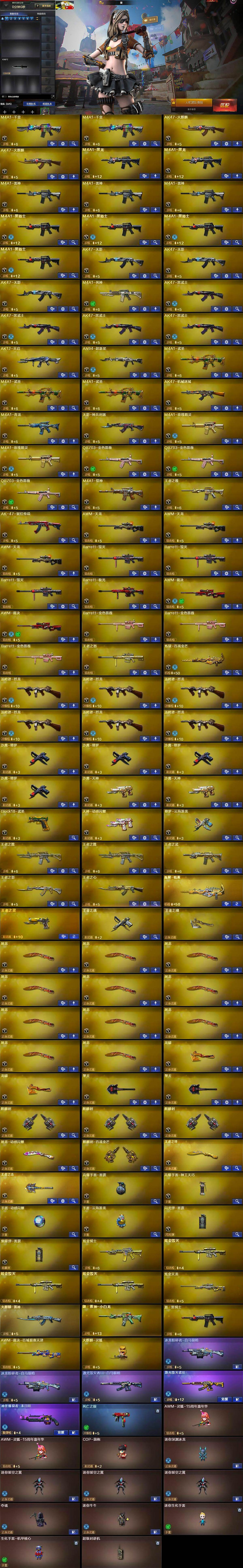 【英雄级武器】:M4A1-千变*2,AK47-火麒麟*2,M4A1-黑龙*2,M4A1-雷神*3,M4A1-黑骑士*4,AK47-无影*3,M4A1-死神,AK47-黑武士*4,AK12-天启,AN94-超新星,M4A1-武圣*3,AK47-机械迷城,M4A1-青龙,无影-神兵利器,M4A1-玫瑰精灵*2,QBZ03-金色蔷薇*3,