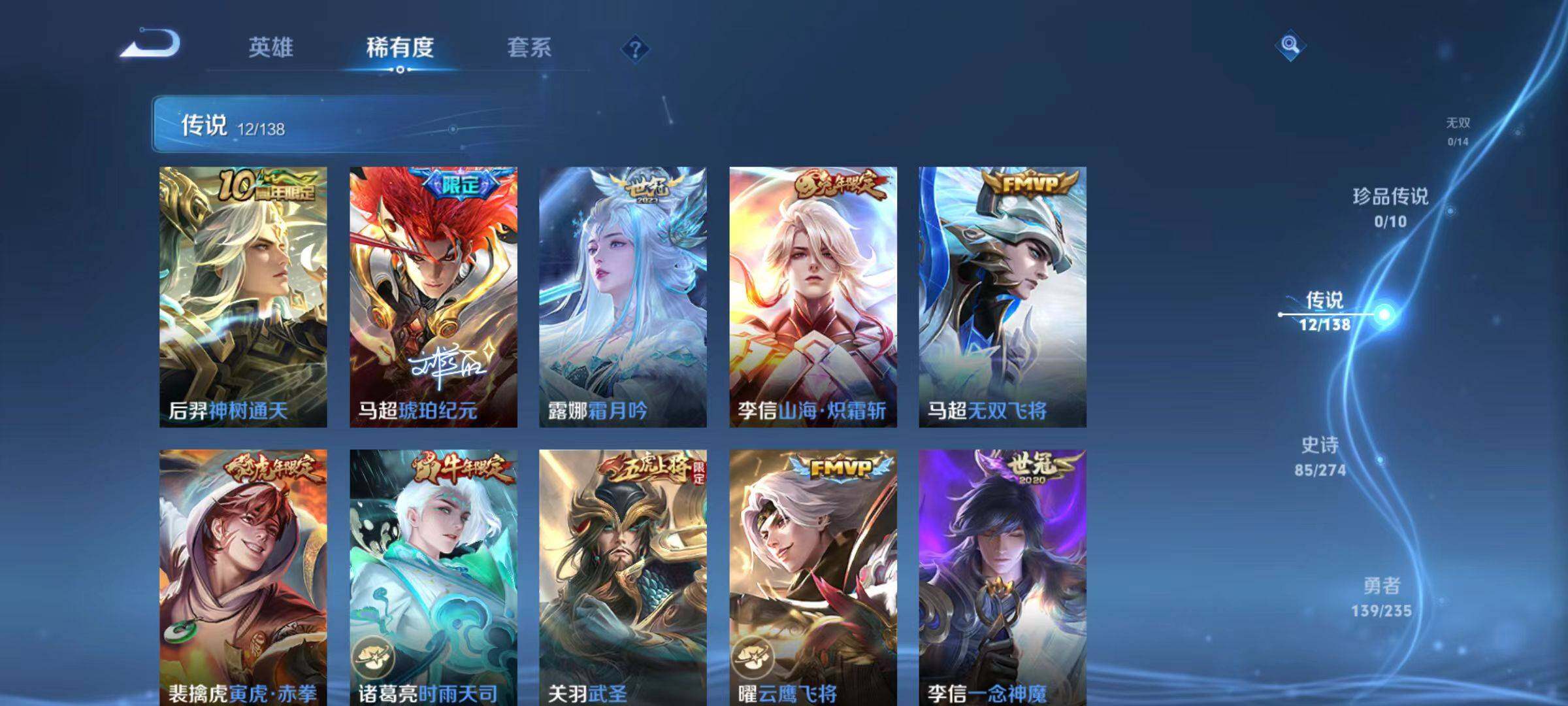 【传说皮肤】:后羿神树通天,马超琥珀纪元,露娜霜月吟,李信山海炽霜斩,马超无双飞将,裴擒虎寅虎赤拳,诸葛亮时雨天司,关羽武圣,曜云鹰飞将,李信一念神魔,刘备时之恋人,达摩黄金狮子座