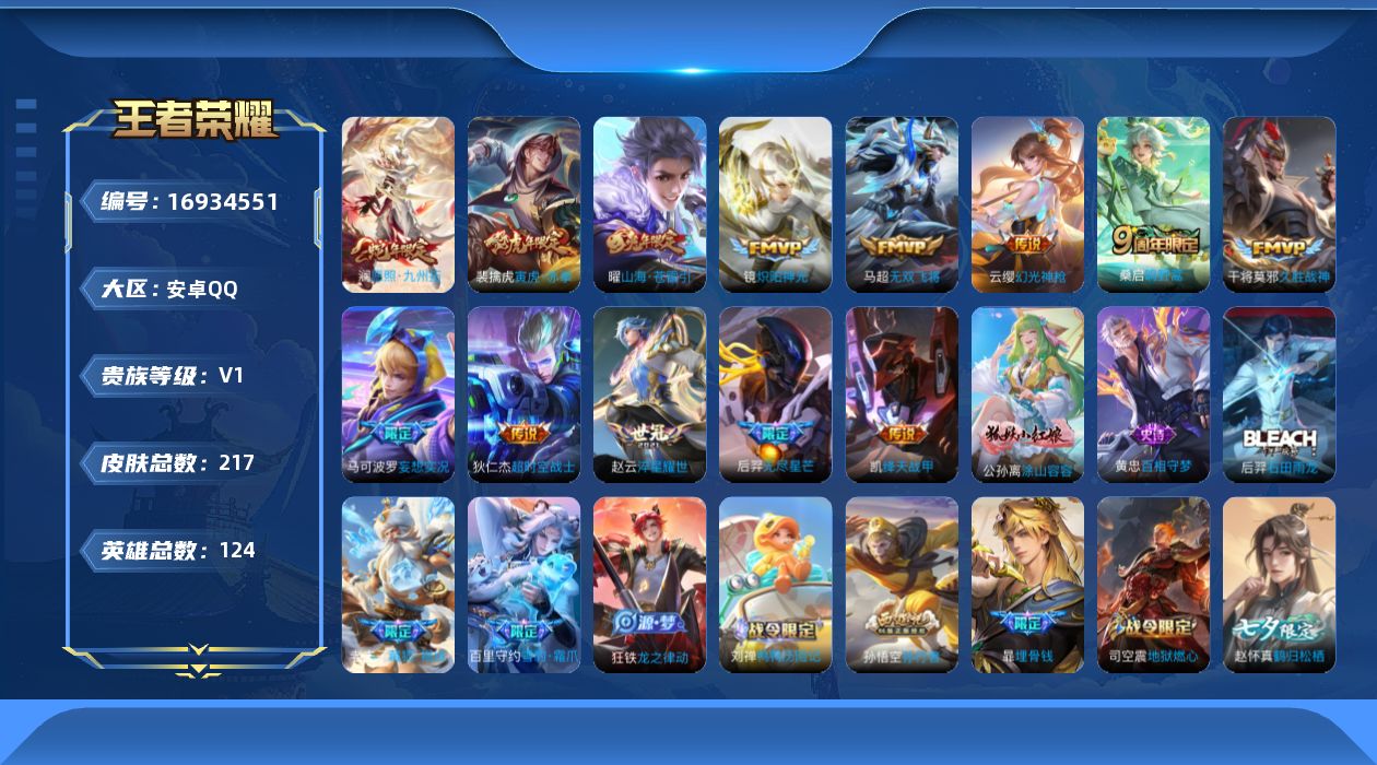 - [11576196]V7 8传说 123英雄 226皮肤 可修改实名 优质装备:猫影幻舞,零号·赤焰,超时空战士-狄仁杰,山海·炽霜斩(李信年限) 传说皮:幻光神枪 珍宝阁皮:女武神,玩趣恶龙 限定皮:逐霄战戟,鸣野蒿,至尊宝,异界灵契(白毛香),诗剑行,五谷丰年,梁祝,李小龙,霸王别姬-虞姬,孙行者,引擎之心,山海·玄木吟(马可年限) 史诗皮:器灵·浮梦炉,绮世丹青,化蝶舞,百相守梦-黄忠,紫霞仙子,江河有灵,魅语,百解令(蒙犽),蒙恬荣光圣徽,冰冠公主,乱世虎臣,节奏热浪,女仆咖啡,摇滚巨星,水果甜心,绅士熊喵,星夜王子,心灵骇客,鬼剑武藏,心灵战警,纤云弄巧,繁星吟游(呼啦呼啦),拒霜思,逐浪之夏,水晶猎龙者,金属风暴,圣诞狂欢,圣诞恋歌,鹰眼统帅,魅力维加斯,无心,未来纪元-赵云