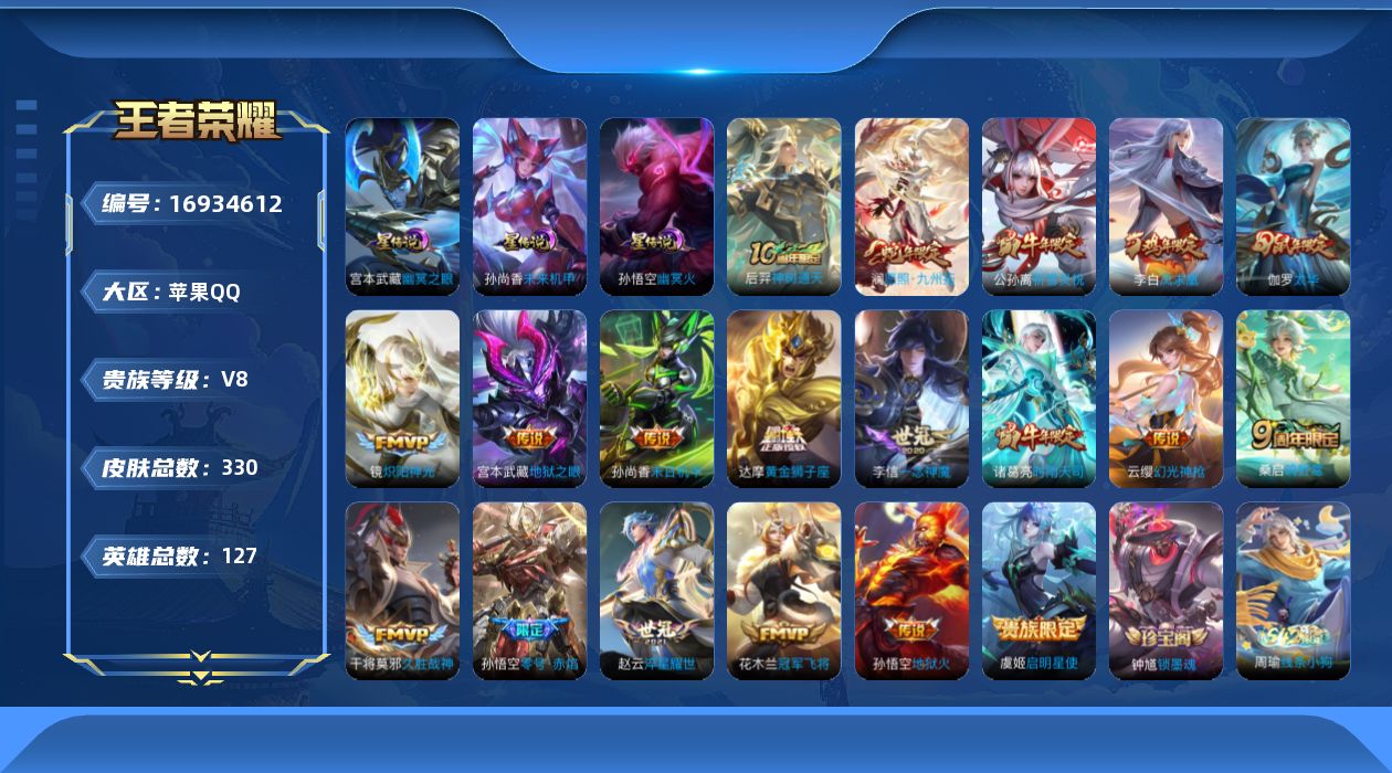 - [12084741]V10 4典藏 1珍品传说 88传说 125英雄 554皮肤 典藏英雄武则天 可修改实名 优质装备:天鹅之梦(小乔典藏),无限飓风号(高达),鸣剑·曳影,幻阙歌(貂蝉典藏),器灵·落星盏,黄金狮子座,黄金射手座,冠军飞将,云鹰飞将(小将军),绛天战甲(鸡嘴战神),黄金白羊座,猫影幻舞,久胜战神,炽阳神光,一念神魔,云霓雀翎,末日机甲-孙尚香(绿蚂蚱),地狱火,仲夏夜之梦(大飞蛾),音你心动-小乔,零号·赤焰,海洋之心,地狱之眼,飞鸢探春,音你心动-周瑜,胖达荣荣,李逍遥,乞巧织情,时之恋人-刘备(电焊工),游龙清影(小青龙),淬星耀世,超时空战士-狄仁杰,末日机甲-孙策,花朝如约(花篮子),挚爱之约,挚爱花嫁,无双飞将,音你闪耀(rap皮),碎云,山海·炽霜斩(李信年限),山海·琳琅生(小乔年限),山海·苍雷引(电光曜子),炽翼辉光(娃娃菜牛角包),燃星之曲,画中仙,大乔-时之奇旅,霜月吟,澜逐花归海,艾琳觅芳踪,黄金天蝎座,涂山容容 传说皮:乘龙·问璇玑(孙尚香年限),乘龙·铭钟鼎(赵云年限),乘龙·淬吴钩(孙策年限),典韦战鼓燎原,铠冥王哈迪斯,续相思,星之鸣奏,幻光神枪 珍宝阁皮:万物之道,蔷薇恋人,女武神 限定皮:愿照·九州拓(澜年限),愿照·福禄聚(蔡文姬年限),愿照·岁时盈(虞姬年限),愿照·山河定(司空震年限),愿照·众生和(妲己年限),愿照·千秋盛(女娲年限),逐霄战戟,映山客,陌上桑,鸣野蒿,夏侯惇霜北刀,至尊宝,白虎志(电光耗子),凤求凰(白切鸡),凤凰于飞,太华(伽罗年限),梅西,武陵仙君(小桃花),异界灵契(白毛香),傲雪梅枪,补天,寅虎·展翼(孙膑年限),前尘镜,星穹之声,时之彼端,白鹤梁神女,魔法小厨娘,白晶晶,时雨天司(水龙头),神威(电光马子),飞衡(韩信年限),玄嵩(庄周年限),山海·碧波行(瑶年限),无限倾心-项羽,瑞麟志(木兰年限),至美·乘鲤谣,遇见飞天,高山流水,诗剑行,无限倾心-虞姬,齐天大圣,匿光决锋者,怒海麟威,降魔,五谷丰年,青龙志(铠年限),冰锋战神,幽恒(沐浴露),武圣,天狼运算者,游园惊梦,梁祝,御风骁将(吕布年限),天狼狩猎者,龙胆,逐梦之翼,逐梦之星,烈魂,岱宗(典韦年限),天狼溯光者,虎魄,逐梦之音,天狼征服者,奔雷神使(牛魔年限),祈雪灵祝(雪兔子),天狼绘梦者,李小龙,逐梦之影,逐梦之光,玄武志(