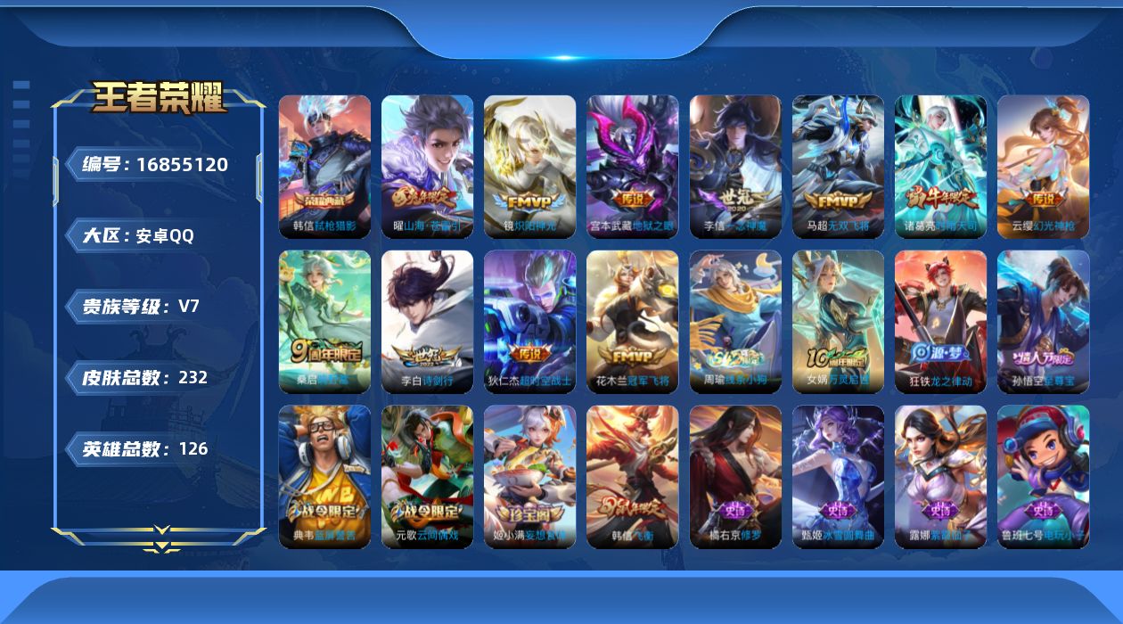 [16855120]安卓Q-V7-最强王者段位-126英雄-232皮肤-1典藏皮肤-11传说-59史诗