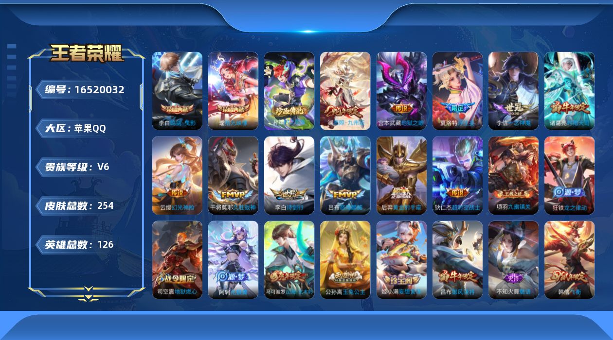 [16520032]苹果Q-V6-126英雄-254皮肤-2典藏皮肤-1珍品传说-11传说-72史诗