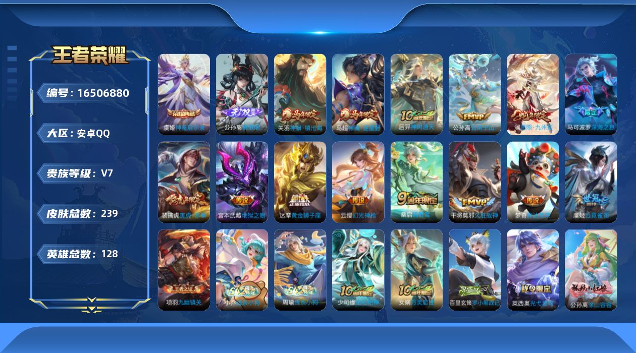[16506880]安卓Q-V7-至尊星耀I段位-128英雄-232皮肤-1典藏皮肤-11传说-75史诗