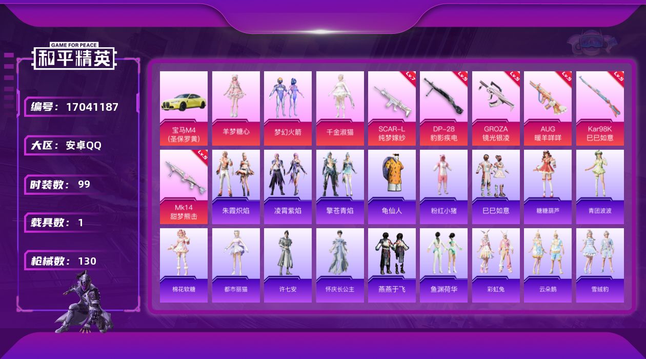 [17041187]安卓 手Q-3粉装-6特效枪-1载具-2粉色飞行器-44559热力值-12王牌印记-99套装-130枪皮 【热门品类】:粉装-梦幻火箭,套装-龟仙人,套装-粉红小猪 【粉色套装】:粉装-梦幻火箭,角色-千金淑猫,角色-羊梦糖心 【粉色枪皮等级】:SCAR-L-纯梦嫁纱(七级),GROZA-镜光银凌(五级),AUG-暖羊咩咩(五级),Kar98K-巳巳如意(五级),Mk14-甜梦熊击(五级),DP-28-豹影疾电(五级) 【粉色载具】:宝马M4(圣保罗黄) 【粉色枪皮】:SCAR-L-纯梦嫁纱,GROZA-镜光银凌,AUG-暖羊咩咩,Kar98K-巳巳如意,Mk14-甜梦熊击,DP-28-豹影疾电 【粉色飞行器】:梦幻火箭飞行器 【粉色降落伞】:梦幻火箭降落伞,垂柳戏鸭降落伞,炫光之旅降落伞,创世·救赎降落伞,千金淑猫降落伞,临安公主降落伞,最终圣卫者降落伞,冷漠罗丽降落伞,奇迹舞步降落伞,炫彩糖果降落伞 【稀有套装】:套装-龟仙人,套装-巳巳如意,套装-雪国风尚,套装-糖糖葫芦,套装-青团波波,套装-棉花软糖,角色-都市丽猫,角色-许七安,角色-怀庆长公主,套装-燕燕于飞,套装-鱼渊荷华,套装-彩虹兔,套装-云朵鹅,套装-雪绒豹,角色-灵公主,角色-乐音,角色-夜瞳黯灵,套装-朱霞炽焰,套装-凌霄紫焰,套装-擎苍青焰,套装-炫彩糖果 【稀有枪皮】:AUG-冰晶雪宝,AKM-霓虹街区,AKM-龙的传人,M16A4-幻世战舞者,M16A4-千金淑猫,SCAR-L-玉兔迎春,SCAR-L-红色方程式,SCAR-L-黄金龙骨,M416-糯团青竹,M416-蓝色火焰,GROZA-治愈之星,AUG-天降萌叽,QBZ-彩虹符号,M762-天降萌叽,M762-镭射皇者,M762-云朵鹅,Mk47-妙红点点,AC-VAL-天降萌叽,蜜獾-天降萌叽,蜜獾-娇憨猪猪,ARX-凌霄紫焰,UZI-啾咪啾咪,UZI-娇憨猪猪,UMP45-炫光之旅,UMP45-生命誓言,UMP45-蓝色火焰,汤姆逊-天降萌叽,JS9-凌霄紫焰,P90-飞驰魅影,P90-巳巳如意,Kar98K-炫彩节奏,M24-炫彩节奏,AWM-宁雨蝶,SKS-炫彩节奏,SKS-糯团青竹,Mini14-梦幻火箭,Mini14-涂山之恋,Mini14-炫彩节奏,SLR-娇憨猪猪,SLR-彩虹符号,AMR-妙红点点,M200-无垠
