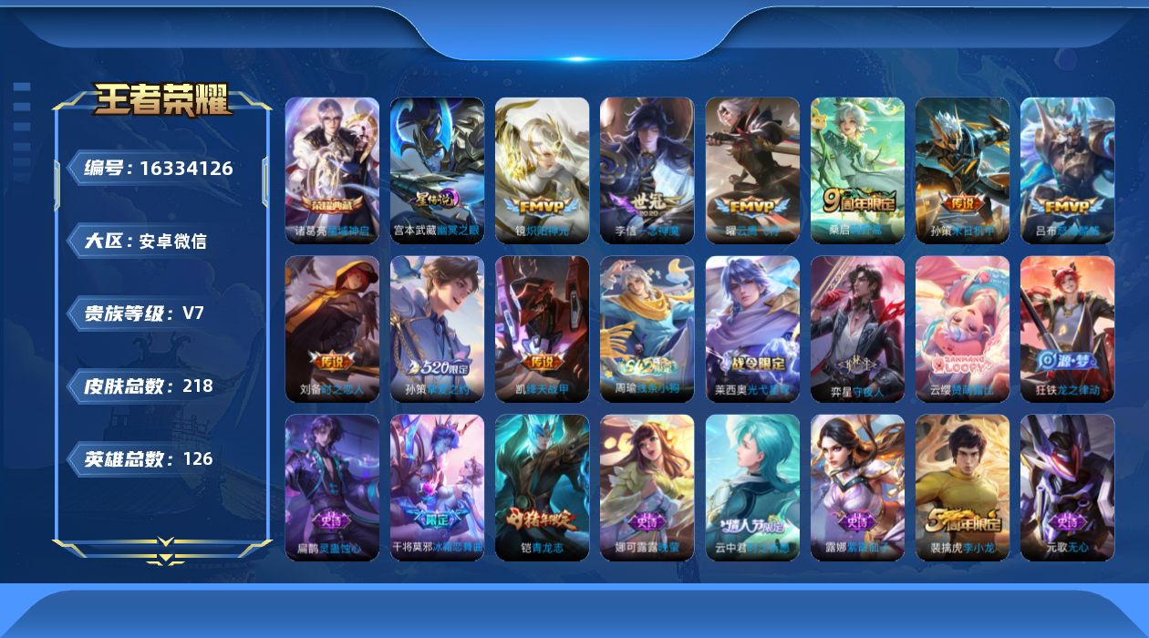 - [12111584]V7 1典藏 15传说 124英雄 329皮肤 可修改实名 优质装备:活力突击,黄金狮子座,冠军飞将,一念神魔,地狱之眼,挚爱之约,无双飞将,山海·炽霜斩(李信年限),山海·苍雷引(电光曜子),惊梅引,澜逐花归海 传说皮:乘龙·铭钟鼎(赵云年限),幻光神枪 珍宝阁皮:妄想食味,蔷薇恋人,女武神 限定皮:鸣野蒿,飞衡(韩信年限),山海·碧波行(瑶年限),影龙天霄,遇见飞天,高山流水,五谷丰年,梁祝,李小龙,猪悟能,大圣娶亲,匿光追影者,寅虎·御盾(廉颇年限),寅虎·瑞焰(虎皮蛋子),时之祈愿-云中君,山海·玄木吟(马可年限) 史诗皮:器灵·浮梦炉,化蝶舞,星界战将,茶境仙,破空之剑,战舞者,蒙犽顽岩魄,埋骨钱,蔬乡物语(鲁班七号),百相守梦-百里守约,紫霞仙子,苍穹之光,黄金分割率,特工魅影,千年之狐,电玩·爆裂旋风,鹤归松栖(赵怀真),江河有灵,百解令(蒙犽),高渐离燃音魔法,银翎春语,蒙恬荣光圣徽,龙骑士(小龙虾),暗夜猫娘,晚萤,冰冠公主,青蛇,末日机甲-吕布,猫狗日记-孙策,猫狗日记-大乔,乱世虎臣,节奏热浪,修罗,女仆咖啡,摇滚巨星,水果甜心,绅士熊喵,天才门将,星夜王子,心灵骇客,功夫厨神,德古拉伯爵,暗隐猎兽者,幽灵船长,鬼剑武藏,心灵战警,天秀·启明,舞动绿茵,地狱岩魂,纤云弄巧,繁星吟游(呼啦呼啦),拒霜思,缤纷独角兽,乘风破浪,逐浪之夏,月团寄思,水晶猎龙者,曙光守护者,箭羽风息,金属风暴,原初追逐者,圣诞狂欢,圣诞恋歌,鹰眼统帅,王者之锤,魅力维加斯,黎明之约,雪上飞焰,赏金猎手,寅虎·御盾,无心,未来纪元-赵云