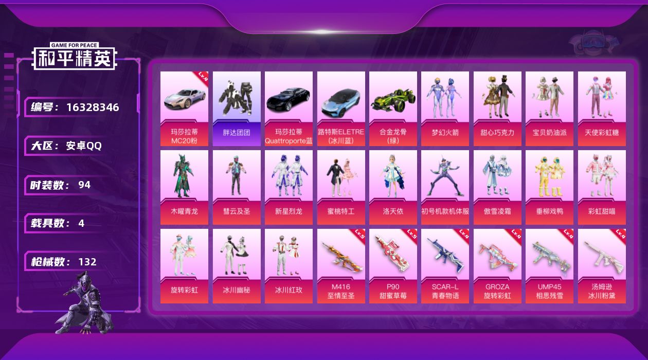 [16328346]【特价出售/店主推荐】安卓 手Q-16粉装-11特效枪-4载具-3粉色飞行器-50473热力值-4王牌印记-94套装-132枪皮【红色载具】:玛莎拉蒂MC20(幻星粉)(四级)【热门品类】:粉装-梦幻火箭,角色-军刀雅典娜,套装-胖达团团,套装-金羽特工,套装-暗影哥特【粉色套装】:粉装-甜心巧克力,粉装-宝贝奶油派,粉装-天使彩虹糖,粉装-木曜青龙,粉装-梦幻火箭,粉装-彗云及圣,粉装-新星烈龙,粉装-蜜桃特工,角色-洛天依,角色-初号机机体服,粉装-傲雪凌霜,粉装-垂柳戏鸭,粉装-彩虹甜喵,粉装-旋转彩虹,粉装-冰川幽秘,粉装-冰川红玫【粉色枪皮等级】:AKM-星际浪客(二级),SCAR-L-青春物语(四级),M416-至情至圣(五级),GROZA-旋转彩虹(四级),UMP45-相思残雪(四级),汤姆逊-冰川粉黛(四级),AKS-74U-森灵之息(三级),P90-甜蜜草莓(五级),M249-绒雪飘舞(一级),M249-彩虹甜喵(二级),MG3-洛神天依(四级)【粉色载具】:路特斯ELETRE(冰川蓝),玛莎拉蒂MC20(幻星粉),玛莎拉蒂Quattroporte(夜幕蓝),合金龙骨(绿)【粉色枪皮】:AKM-星际浪客,SCAR-L-青春物语,M416-至情至圣,GROZA-旋转彩虹,UMP45-相思残雪,汤姆逊-冰川粉黛,AKS-74U-森灵之息,P90-甜蜜草莓,M249-绒雪飘舞,M249-彩甜喵,MG3-洛神天依【粉色飞行器】:相思残雪飞行器,甜蜜草莓飞行器,千面幻镜飞行器