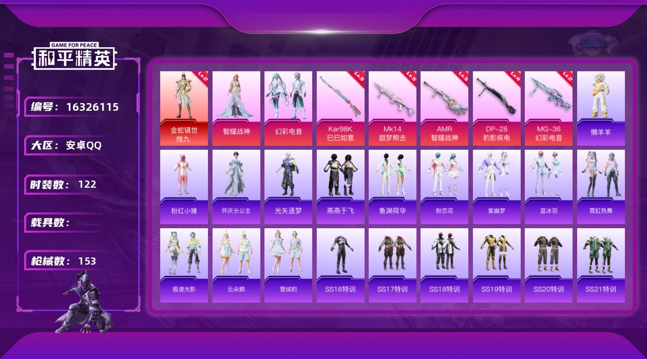 [16326115]【特价出售/店主推荐】安卓 手Q-1神装-2粉装-5特效枪-0载具-1粉色飞行器-44550热力值-7王牌印记-122套装-153枪皮【红色神装等级】:金蛇镇世-烛九(二级)【红色角色神装】:金蛇镇世-烛九【热门品类】:套装-粉红小猪【粉色套装】:角色-智耀战神,粉装-幻彩电音【粉色枪皮等级】:Kar98K-巳巳如意(五级),Mk14-甜梦熊击(五级),AMR-智耀战神(五级),DP-28-豹影疾电(四级),MG-36-幻彩电音(二级)【粉色枪皮】:Kar98K-巳巳如意,Mk14-甜梦熊击,AMR-智耀战神,DP-28-豹影疾电,MG-36-幻彩电音
