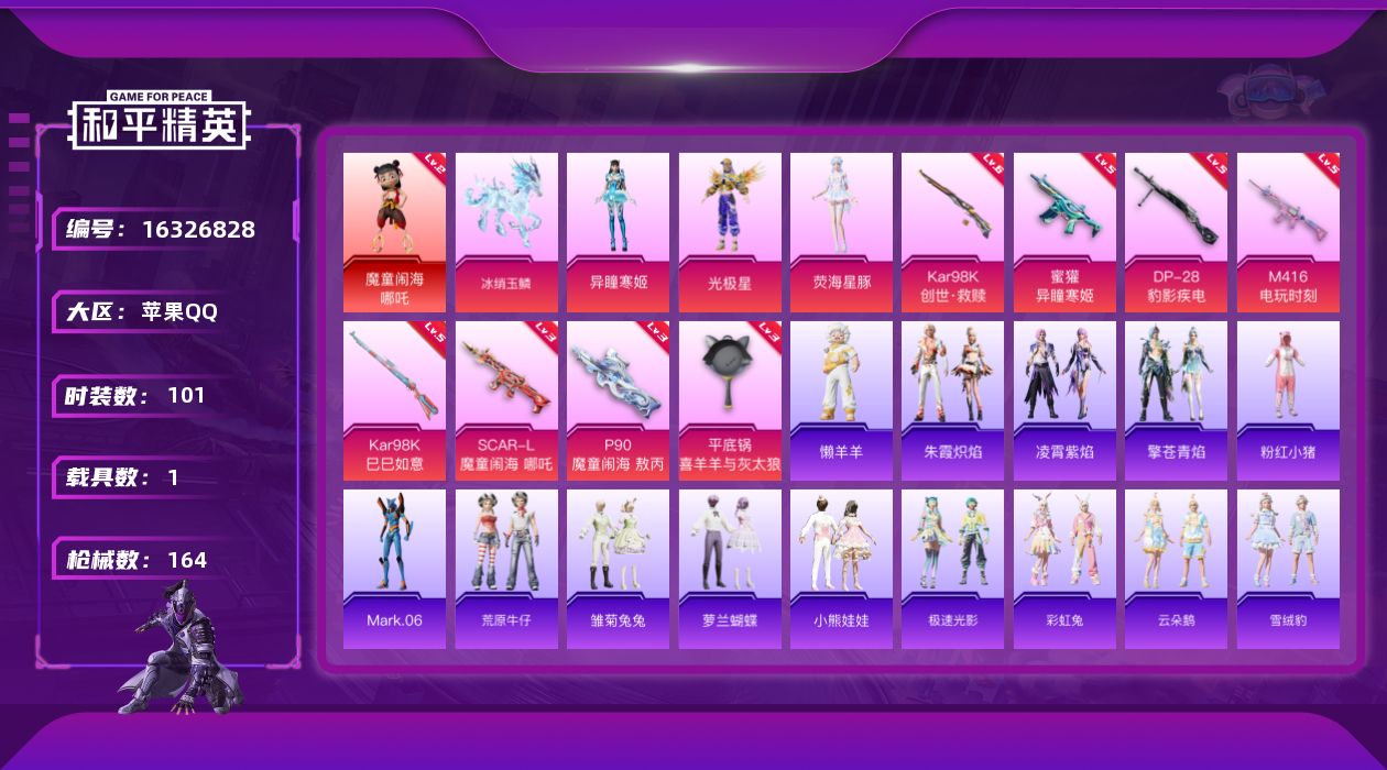 [16326828]【特价出售/店主推荐】苹果 手Q-1神装-3粉装-8特效枪-1载具-3粉色飞行器-50861热力值-9王牌印记-101套装-164枪皮【红色神装等级】:魔童闹海-哪吒(二级)【红色角色神装】:魔童闹海-哪吒【热门品类】:套装-粉红小猪,角色-Mark.06【粉色套装】:角色-光极星,角色-荧海星豚,角色-异瞳寒姬【粉色枪皮等级】:SCAR-L-魔童闹海 哪吒(三级),M416-电玩时刻(五级),蜜獾-异瞳寒姬(五级),P90-魔童闹海 敖丙(三级),Kar98K-创世·救赎(六级),Kar98K-巳巳如意(五级),DP28-豹影疾电(五级),平底锅-喜羊羊与灰太狼(三级)【粉色载具】:冰绡玉鳞【粉色枪皮】:SCAR-L-魔童闹海 哪吒,M416-电玩时刻,蜜獾-异瞳寒姬,P90-魔童闹海 敖丙,Kar98K-创世·救赎,Kar98K-巳巳如意,DP-28-豹影疾电,平底锅-喜羊羊与灰太狼【粉色飞行器】:灵珠游龙飞行器,极意拳锋飞行器