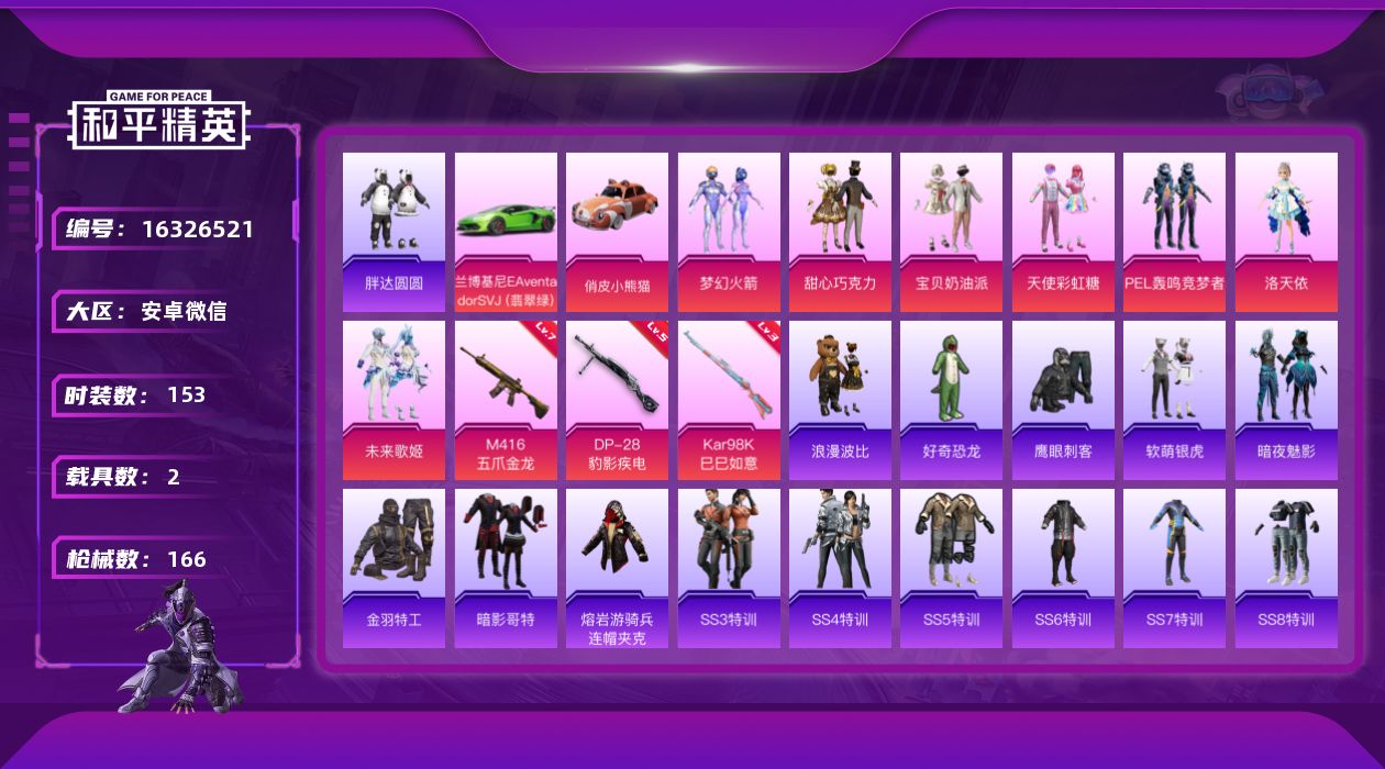 [16326521]【特价出售/店主推荐】安卓 微信-7粉装-3特效枪-2载具-1粉色飞行器-56489热力值-6王牌印记-153套装-166枪皮【热门品类】:粉装-梦幻火箭,套装-胖达圆圆,套装-金羽特工,套装-暗影哥特,套装-浪漫波比,熔岩游骑兵连帽夹克【粉色套装】:粉装-甜心巧克力,粉装-宝贝奶油派,粉装-天使彩虹糖,粉装-梦幻火箭,粉装-PEL轰鸣竞梦者,角色-洛天依,粉装-未来歌姬【粉色枪皮等级】:M416-五爪金龙(七级),Kar98K-巳巳如意(三级),DP-28-豹影疾电(五级)【粉色载具】:兰博基尼Aventador SVJ(翡翠绿),俏皮小熊猫【粉色枪皮】:M416-五爪金龙,Kar98K-巳巳如意,DP-28-豹影疾电
