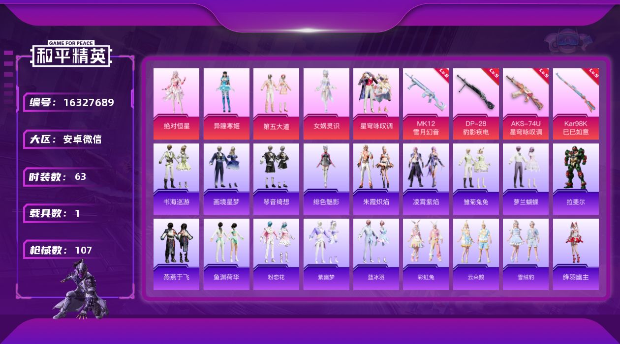 [16327689]【特价出售/店主推荐】安卓 微信-1神装-5粉装-4特效枪-1载具-5粉色飞行器-34504热力值-5王牌印记-63套装-107枪皮【红色神装等级】:暮色玫影-艾丽娅(一级)【红色角色神装】:暮色玫影-艾丽娅【粉色套装】:角色-绝对恒星,粉装-第五大道,角色-女娲灵识,粉装-星穹咏叹调,角色-异瞳寒姬【粉色枪皮等级】:AKS-74U-星穹咏叹调(五级),Kar98K-巳巳如意(五级),MK12-雪月幻音(六级),DP-28-豹影疾电(五级)【粉色载具】:暮色幽蹄【粉色枪皮】:AKS-74U-星穹咏叹调,Kar98K-巳巳如意,MK12-雪月幻音,DP-28-豹影疾电【粉色飞行器】:镜光幻境飞行翼,戏水时光飞行器,墨金战记飞行器,暮色之舞飞行器