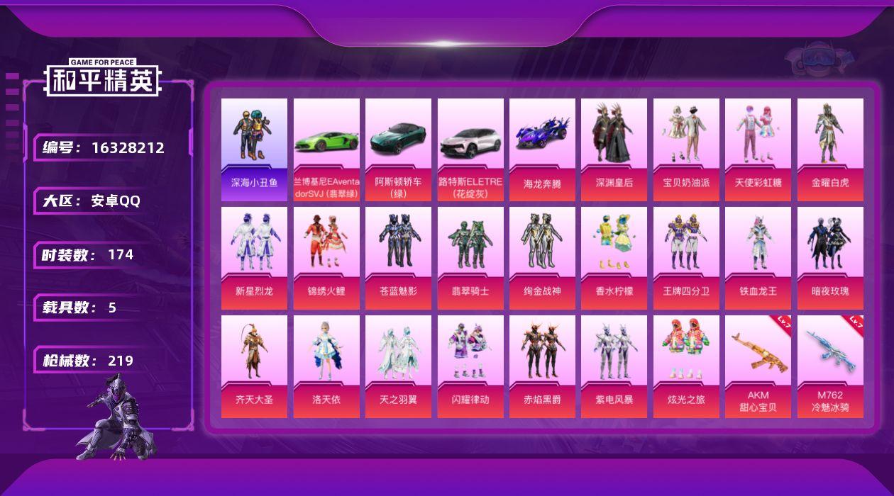 [16328212]【特价出售/店主推荐】安卓 手Q-20粉装-16特效枪-5载具-6粉色飞行器-95341热力值-17王牌印记-174套装-219枪皮【热门品类】:套装-深海小丑鱼,套装-小丑鱼,角色-军刀雅典娜,套装-龟仙人,套装-暗影哥特,套装-粉红小猪【粉色套装】:粉装-深渊皇后,粉装-宝贝奶油派,粉装-天使彩虹糖,粉装-金曜白虎,粉装-新星烈龙,粉装-锦绣火鲤,粉装-苍蓝魅影,粉装-翡翠骑士,粉装-绚金战神,粉装-香水柠檬,粉装-王牌四分卫,粉装-铁血龙王,粉装-暗夜玫瑰,粉装-齐天大圣,角色-洛天依,粉装-天之羽翼,粉装-闪耀律动,粉装-赤焰黑爵,粉装-紫电风暴,粉装-炫光之旅【粉色枪皮等级】:AKM-甜心宝贝(七级),SCAR-L-机甲封神(六级),SCAR-L-甜梦小狐(四级),M416-心之恋语(一级),M416-风花雪月(六级),M762-甜蜜誓约(一级),M762-冷魅冰骑(七级),UMP45-雪国精灵(四级),Kar98K-伏魔团(四级),Kar98K-巳巳如意(三级),Mini14-荧光虫舞(一级),SLR-暗夜玫瑰(二级),DP-28-幻梦音符(四级),DP-28-豹影疾电(一级),MG3-洛神天依(四级)【粉色载具】:兰博基尼Aventador SVJ(翡翠绿),阿斯顿马丁DBS(绿),路特斯ELETRE(花绽灰),海龙奔腾,僚机-萌兔起飞【粉色枪皮】:AKM-甜心宝贝,SCAR-L-机甲封神,SCAR-L-甜梦小狐,M416-心之恋语,M416-风花雪月,M762-甜蜜誓约,M762-冷魅冰骑,UMP45-雪国精灵,Kar98K-伏魔团,Kar98K-巳巳如意,Mini14-荧光虫舞,Mk14-闲梦青缨,SLR-暗夜玫瑰,DP-28-幻梦音符,DP-28-豹影疾电,MG3-洛神天依【粉色飞行器】:锦绣火鲤飞行器,阿狸红飞行器,天之羽翼飞行器,星夜魔法师飞行翼,闪光银龙飞行器,歌者泠鸢飞行器