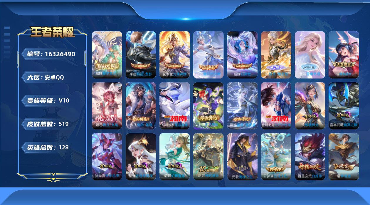 [16326490]安卓Q-V10-518皮肤-4典藏皮肤-1典藏英雄-1珍品无双-4无双-5珍品传说-45传说-171史诗